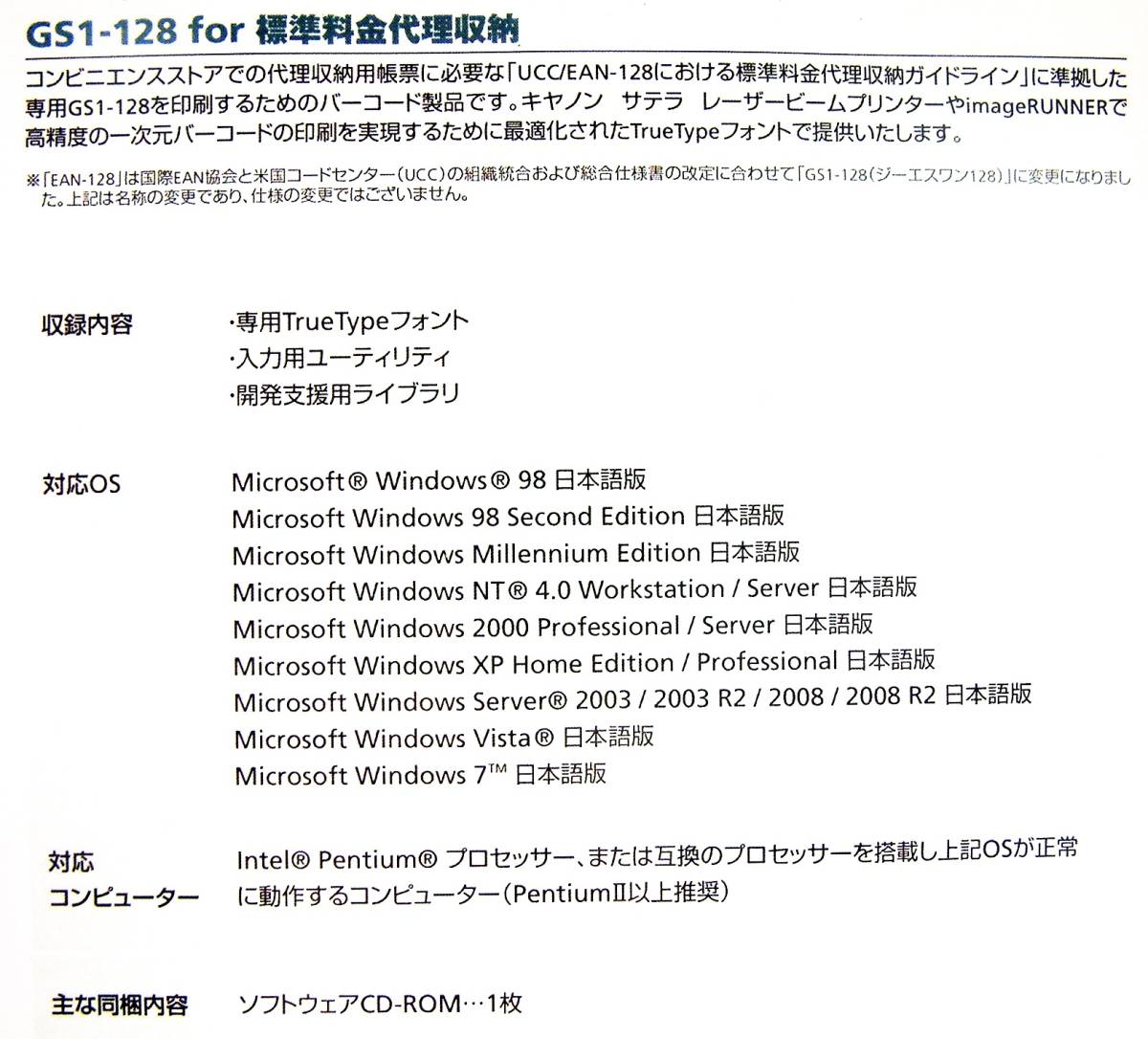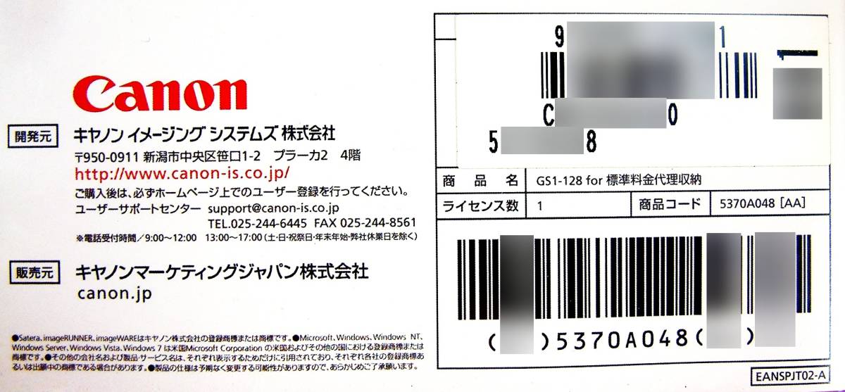 【3679】 キャノン GS1-128 for 標準料金代理収納 Canon コンビニでの代理収納用帳票に必要なUCC/EAN-128準拠バーコードの印刷 ソフト開発