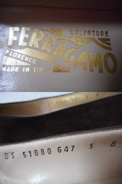【ブランド・形態】 Salvatore Ferragamo サルヴァトーレ フェラガモ スエードパンプス サイズ5B(22.0cm) イタリア製です。 【カラー】 ブラウンです。 掲載の実物写真はPC環境や光の加減により実物と色合いが若干異なる場合があります。 【特徴】 Salvatore Ferragamo サルヴァトーレ フェラガモのスエードパンプスです。 シンプルな形状のフェミニンなセミスクエアトゥパンプスです。 安定感のあるヒールを採用して、快適な履き心地も実現。 スタイリングを引き締めるシックなカラーも魅力です。 普段使いからフォーマルなシーンにもお使いいただけます。 ヒール高さ:4.5cm、 最大幅:7.5cm 【状態】 少々使用感はございますが、特に目立つダメージは見受けられず、使用に問題無いと思われます。 アッパー後部に擦り傷があります。アウトソール・ヒールはそれなりにすり減りがあります。 箱は付属しません。 【素材】 アッパー素材:本皮革 アウトソール素材:皮革底 【サイズ】 5(22.0cm)、 重量:380g | |||