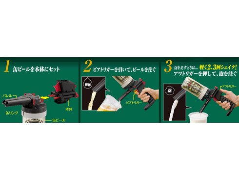 ![]() | 【使い方簡単】 1:缶ビールを本体にセット。 2:ビアトリガーを引いて、ビールを注ぐ。 3:泡を足すときは軽く2,3回シェイク。アワトリガーを押して、泡を注ぐ。 |