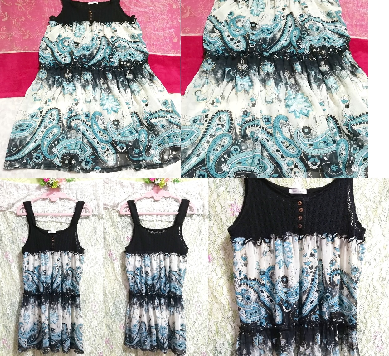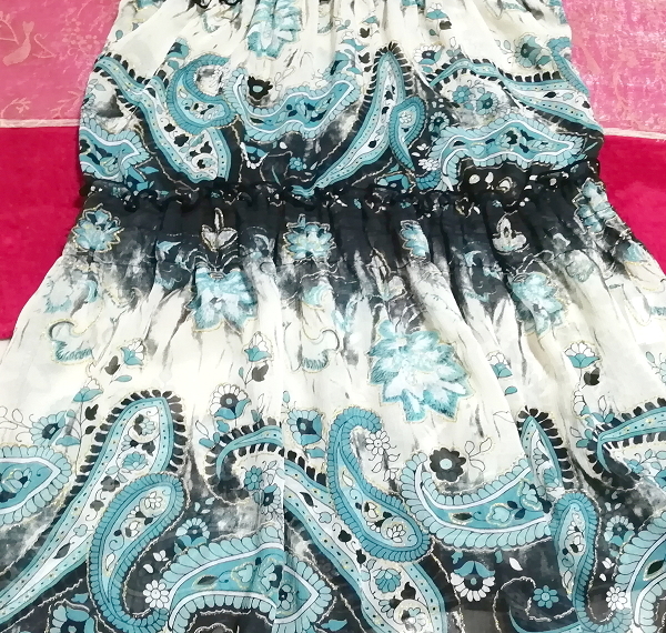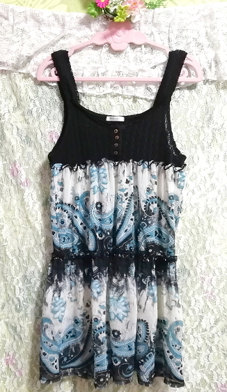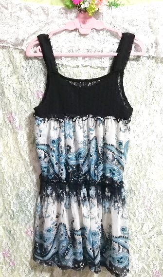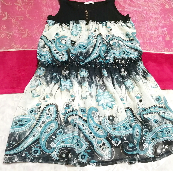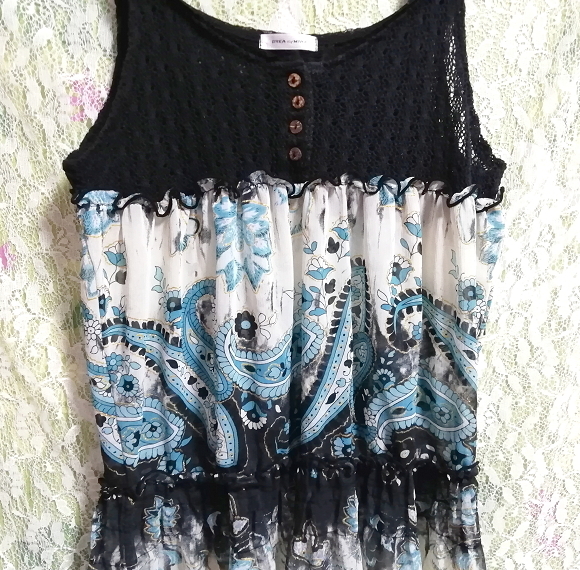 黒ニット青エスニック柄スカートノースリーブネグリジェチュニックワンピース Black knit blue ethnic pattern skirt negligee tunic dress