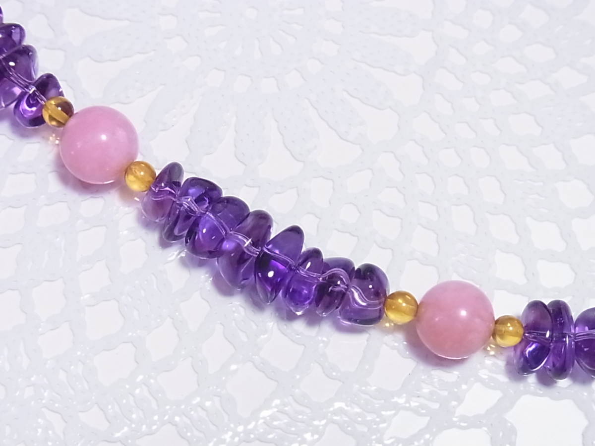 【数量限定販売になります】 一般的にビーズに使われるアメシストは、 クラックやインクルージョンが多い品質の石が使われていますが、このアメシストはビーズとしては非常にクリーンで高品質なアメシストを使用しています。 また一般的なサザレは、尖った部分が多く肌にあたると痛いのですが、このサザレは綺麗に研磨してありますので、肌にあたっても痛くありません。 使用石 : 天然アメシスト(サザレ) 天然ピンクオパール 10mm 色むらがあります 天然ブラックカルセドニー(染色処理) 約4mm 天然琥珀 4mm ※のインクルージョンが非常に少ないタイプの琥珀です 長さ : 約60+5cm 最大幅 : 約12mm 形状が不定形の為、目安になります 重さ : 約48g 留め金 : 引き輪式 アジャスター約5cm 真鍮(ロジウム・コーティング) 画像はサンプル画像ですが、サンプル画像と遜色のない商品をお送りします。 | |||