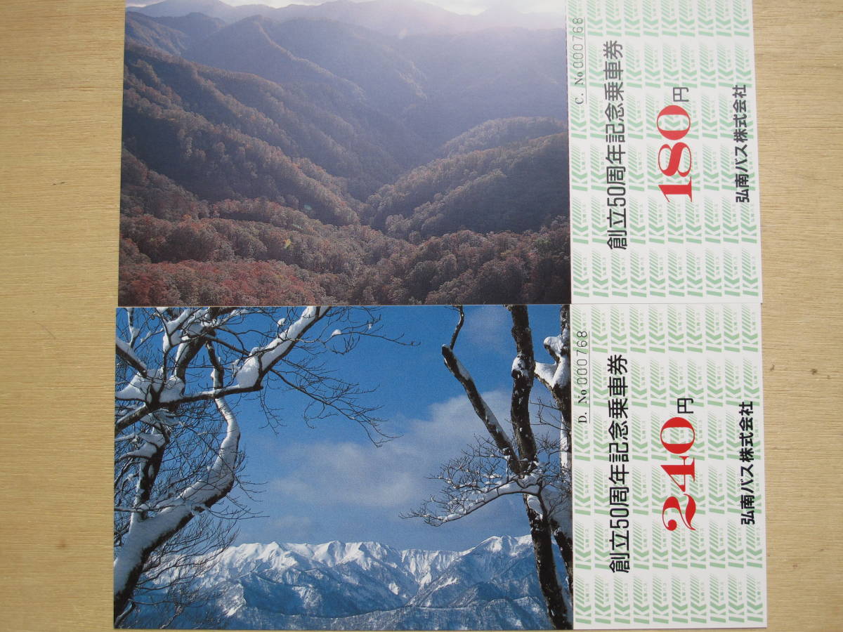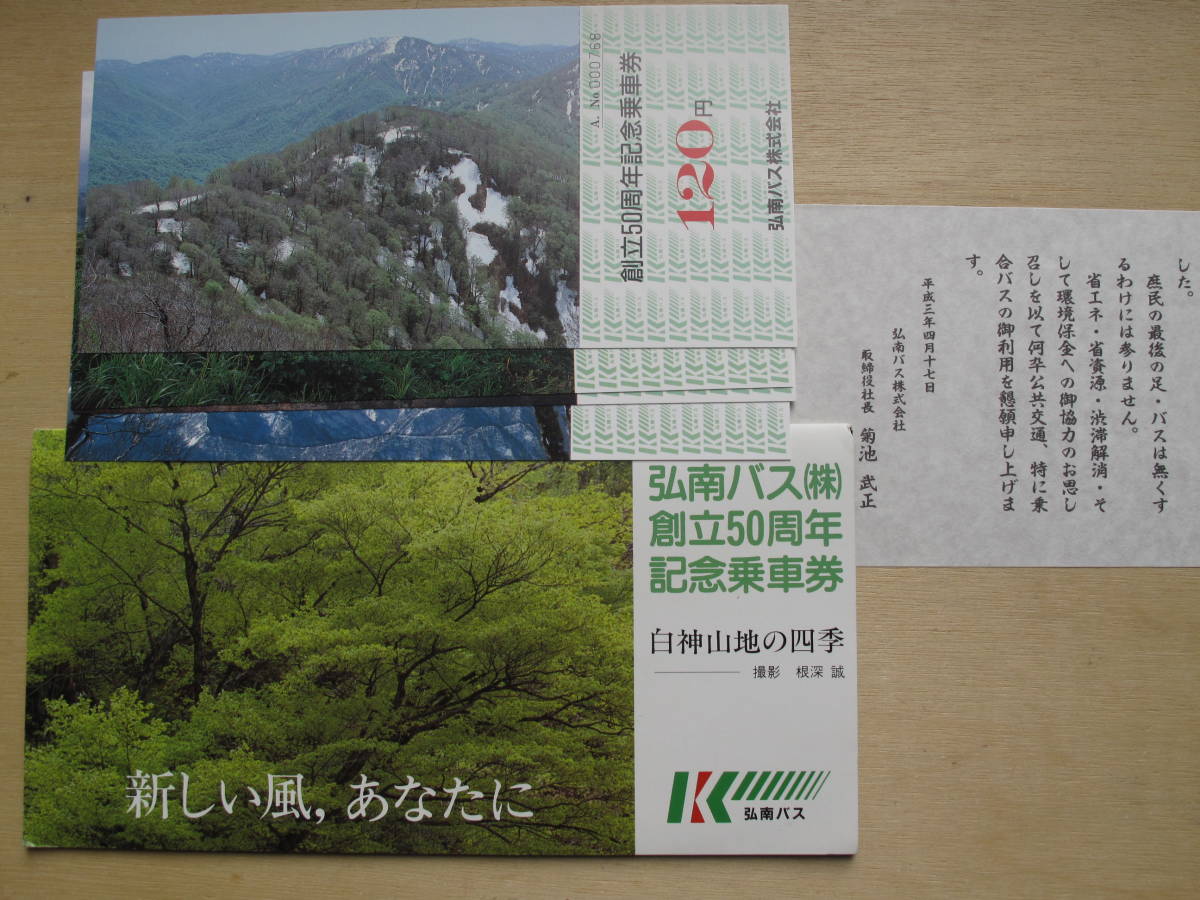 平成3年4月17日の日付のある、弘南バスの発行した、創立50周年 記念乗車券 4枚袋入り です。あいさつカード付き。白神山地の四季を撮影したカラー写真が使われ、裏面は絵葉書となっています。 袋サイズはタテ12.0cm×ヨコ23.8cm。 袋の右上隅と左下隅に極小傷みがありますが、美品です。 定形外郵便180円でお送りします。 ★保存状態の記述は、あくまで個人的な評価ですので、保存状態に厳しい方は、入札をご遠慮願います。