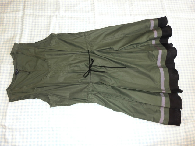 イタリア製 色は深緑 グレーのテープ、黒のフリル 素敵なシルエットになります。 注:これはユニクロとのコラボ商品ではありません。 素材:綿65%ナイロン35% 別布シルク100% テープポリエステル100% サイズ38(M) 肩幅33cm胸幅44cm着丈93cm(肩からウエストの紐まで45cm) 他にも洋服、バッグ、靴、小物、本を出品していますので見てください。