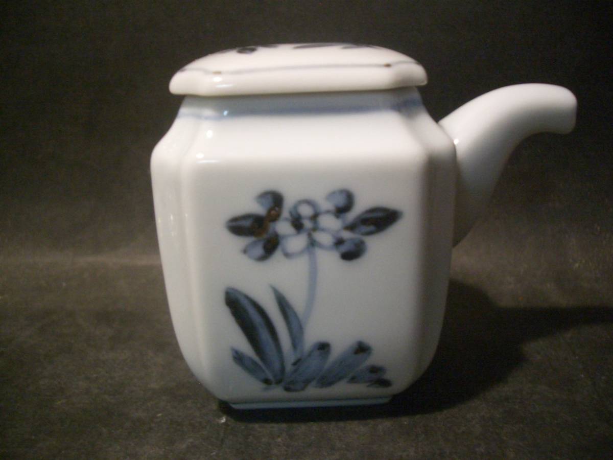 【調味料容器】上品な花柄の染付装飾の「醤油注し」★陶磁器★ほど良い大きさです。★卓上サイズ★美品★旧家蔵出物