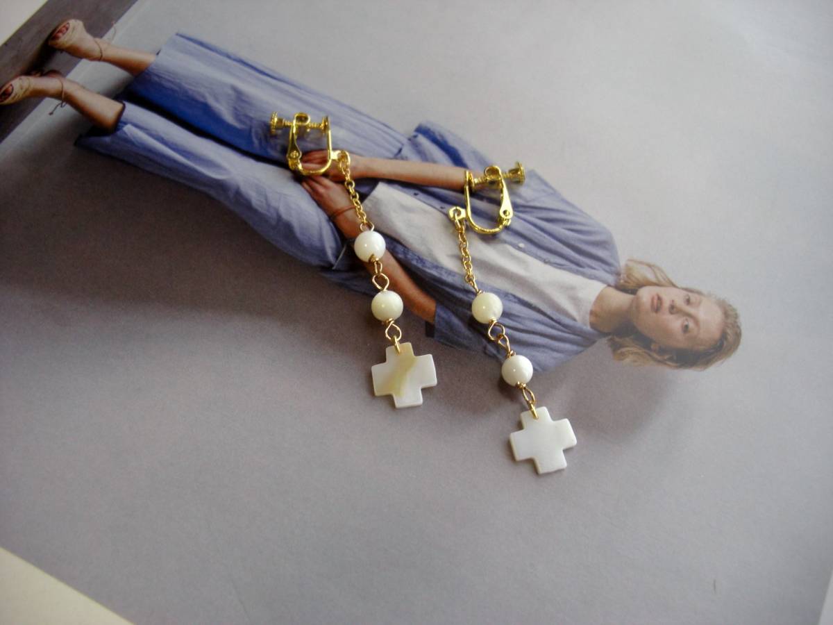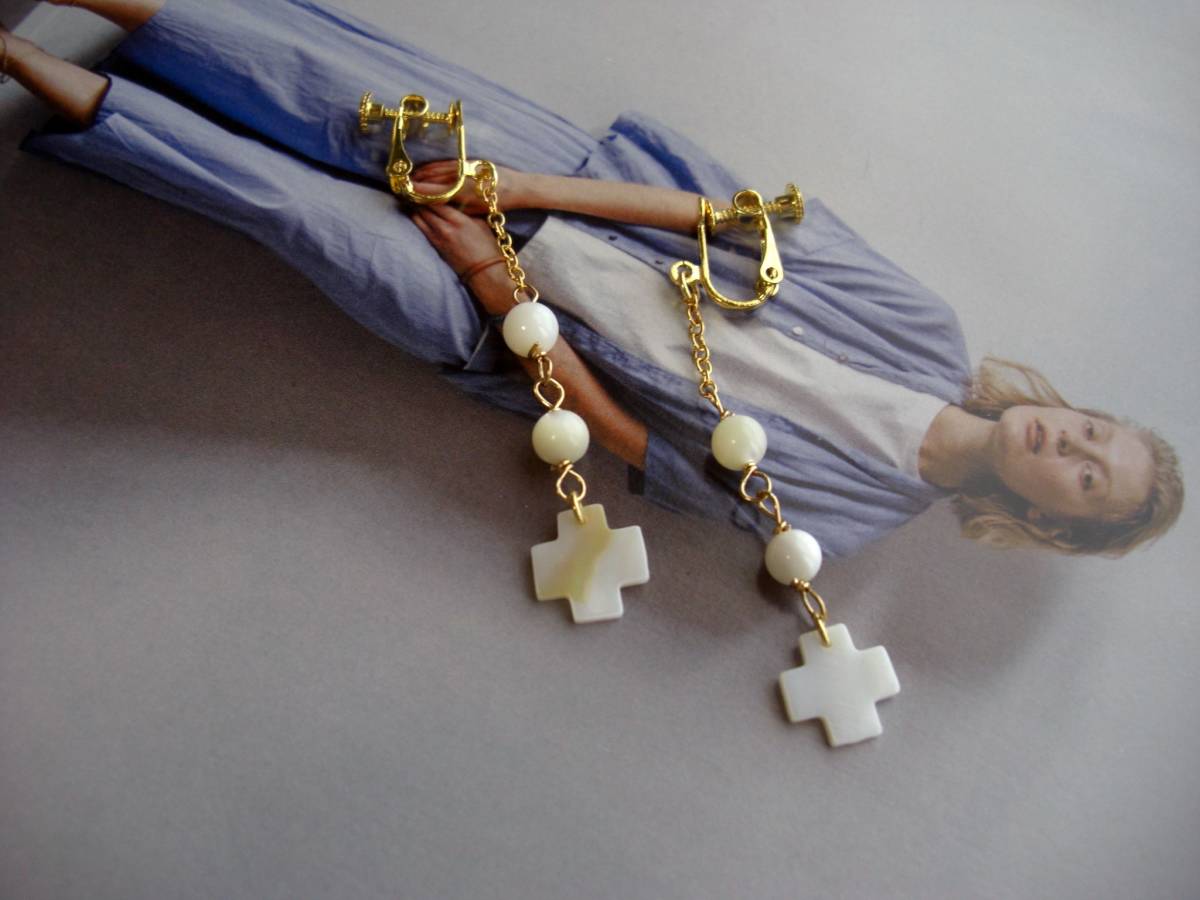 夏色・見本帖・・シェルの魔法・ナチュラルな色合いが素敵なシェルのイヤリングです♪ クロスのシェルが大人のロマン チックしています♪6ミリの丸玉のシェルは トップに12ミリ位のシェルクロスを合わせました♪長さは全長7センチです♪ピアスに変更出来ます♪お揃いのシリーズも 出品しています♪シンプルで長く着けていただけるデザインを考えて作りました♪ ハンドメイドをご理解頂いてノークレーム、ノーリターンでお願いします