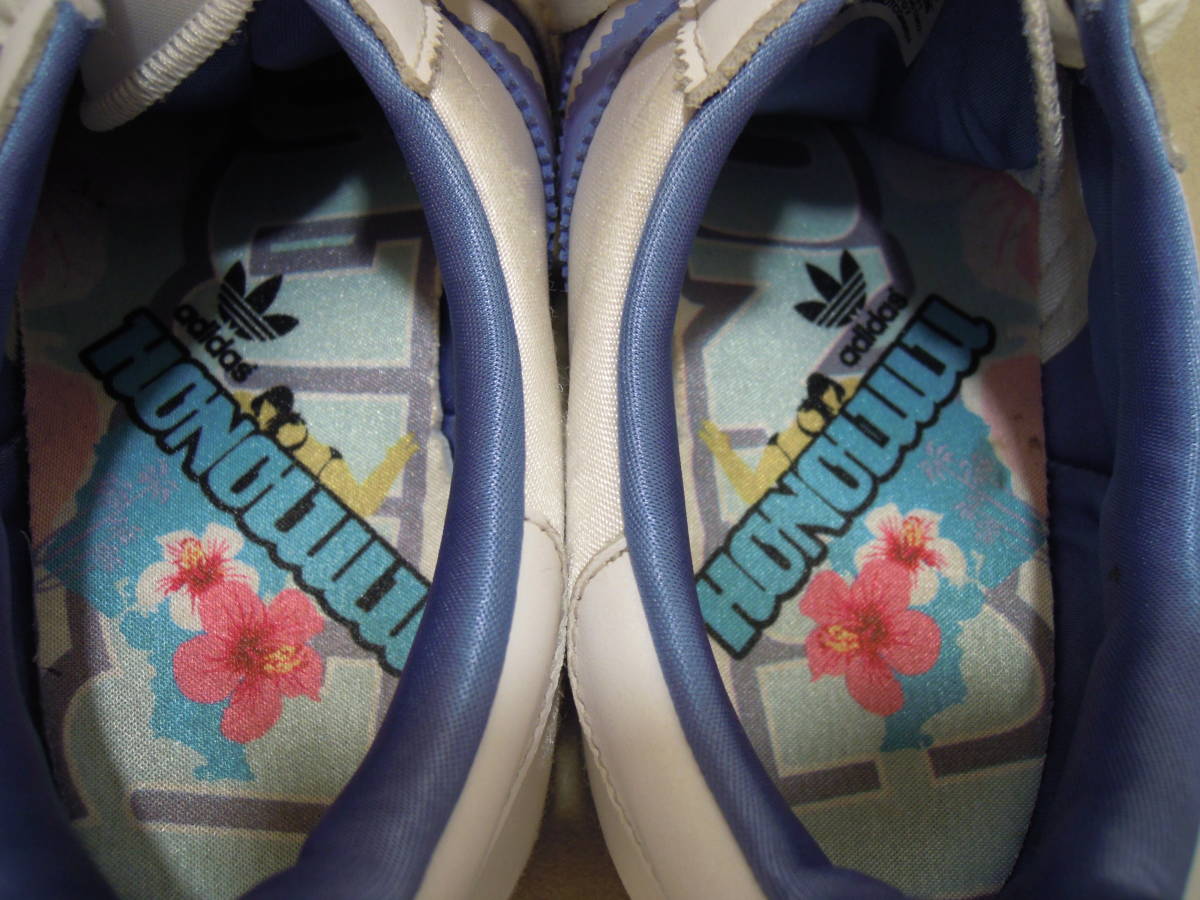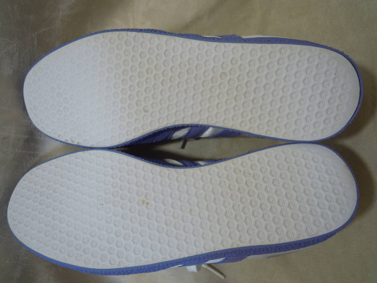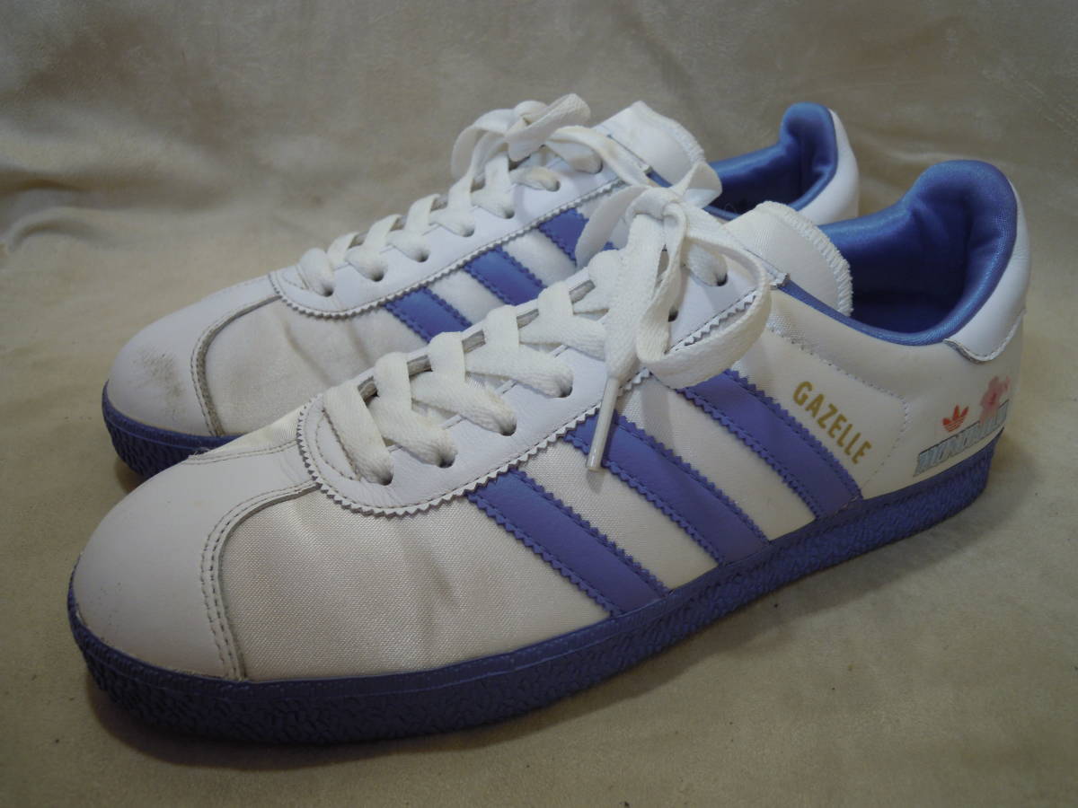 【ブランド・形態】 adidas Originals アディダス GAZELLE 2W (HONOLULU) 561962 サイズ24.0cmです。 【カラー】 ホワイト/バハブルー/メタリックゴールドです。 掲載の実物写真はPC環境や光の加減により実物と色合いが若干異なる場合があります。 【特徴】 クラシックなGazelleガッツレーを鮮やかにデザインしたモデル。 世界の素晴らしい観光地ホノルルを称える特徴的なモデルです。 ハワイの花ハイビスカスがアッパーサイド・インソールにあしらわれていてカワイイです。 ヒール高:約2.0cm、最大幅:約9.0cm 【状態】 少々使用感はございますが、特に目立つダメージは見受けられず、使用に問題無いと思われます。 アッパーはつま先に擦れ傷がありますが、比較的にきれいです。ヒールは少しすり減りがあります。 保管箱はありません。 今は入手が難しいレアなスニーカーです。この機会に是非、早い者勝ちですよ。 【素材】 アッパー:本皮革/サテン地 アウトソール:ラバー 【サイズ】 24.0cm、 質量:595g | |||