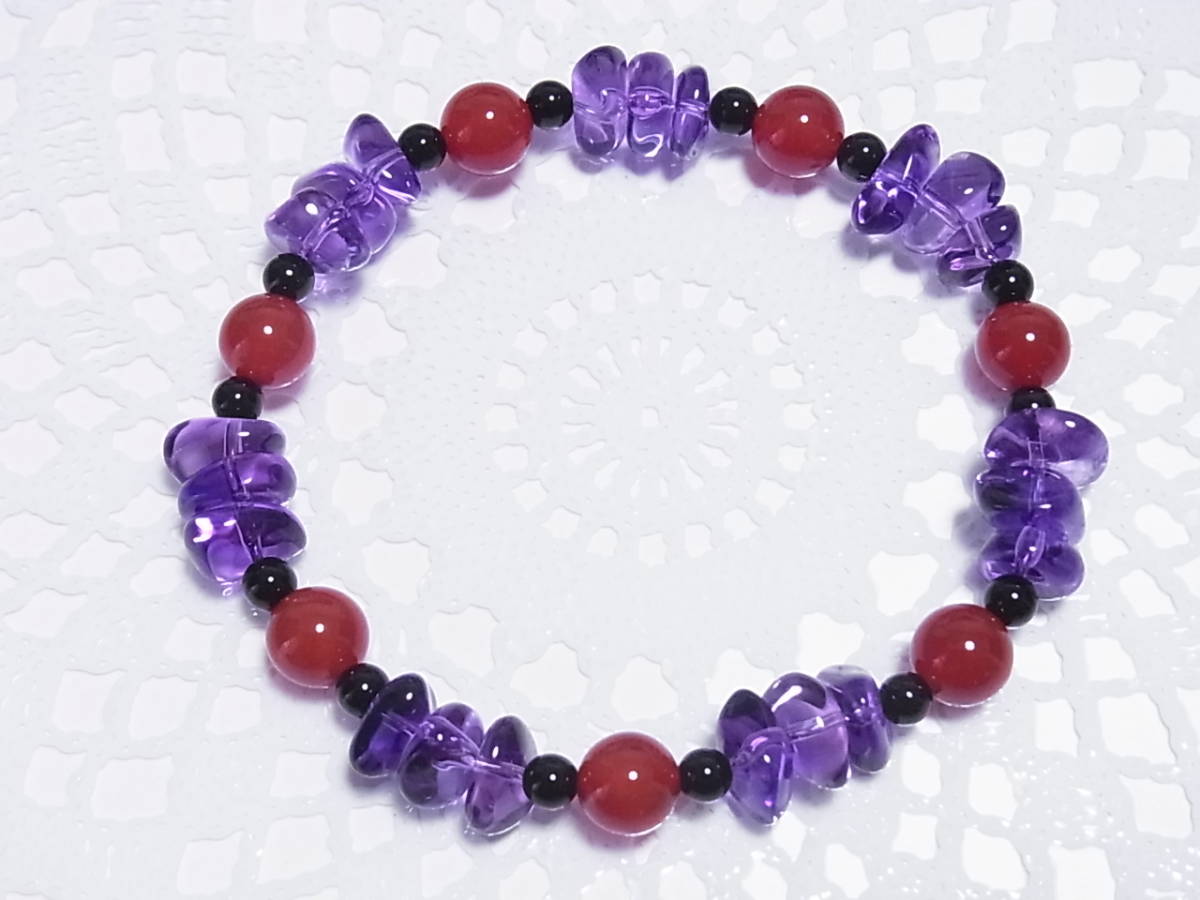 【数量限定販売になります】 一般的にビーズに使われるアメシストは、 クラックやインクルージョンが多い品質の石が使われていますが、このアメシストはビーズとしては非常にクリーンで高品質なアメシストを使用しています。 また一般的なサザレは、尖った部分が多く肌にあたると痛いのですが、このサザレは綺麗に研磨してありますので、肌にあたっても痛くありません。 伸縮ブレスレットですので、脱着が簡単です。 使用石 : 天然アメシスト 天然ブラックカルセドニー(染色処理) 天然カーネリアン(染色処理) 内周 : 約18cm 最大幅 : 約9mm 形状が不定形の為、目安になります ポリウレタンゴム使用 クラックやインクルージョンが確認できますが、天然石の証明です。 【備考】 誠に勝手ながら、土、日曜日、祝日、長期休暇は、 発送業務をお休みさせていただいておりますので、ご了承下さい。 画像はサンプル画像ですが、サンプル画像と遜色のない商品をお送りします。 出来るだけ実物に近い画像を使っておりますが、実物と多少色が異なる場合がありますので、ご了承下さい。 環境に配慮して、必要以上の梱包をしておりませんのでご理解下さい。 基本的にはチャック袋等に商品を入れ、緩衝材で壊れないように保護してお送り致します。 プレゼント梱包はご対応しておりませんので、ご了承下さい。 スムーズなお取り引きを心掛けておりますが、仕事の都合上、ご返信、発送等に 多少お時間を頂く場合もあるかと思いますが、ご理解の程、よろしくお願いします。 ノークレーム、ノーリターンでお願い致します。 | |||