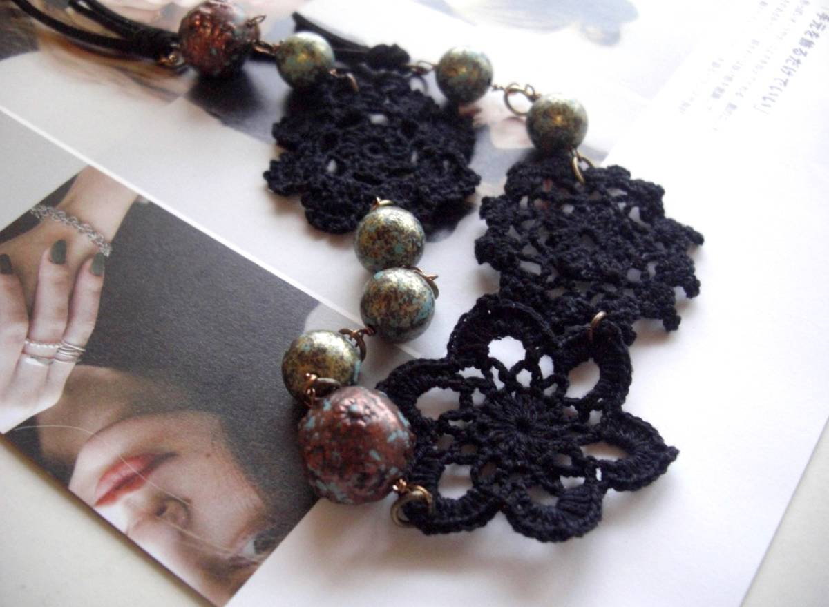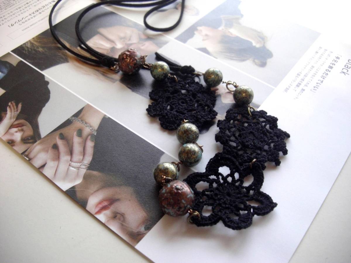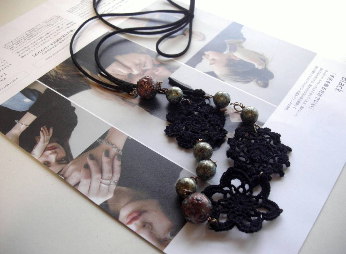初夏の色を+して・・シリーズです♪パンクと黒レース・・パンクっぽい樹脂ビーズとシックな黒レースを合わせたネックレスです♪メタリックな柄の樹脂ビー ズは10ミリと15ミリの大きさ違い、黒の綿レースは40ミリから45ミリ位です♪黒なので甘すぎないロマンチックな表情です♪長さは全長120セン チ位でスェード紐で調節出来ます♪お揃いのブレスレットも出品しています♪いつまでも着けられるデザイ ンを考えて作りました♪ハンドメイドをご理解頂いてノーク レーム、ノーリターンでお願いします