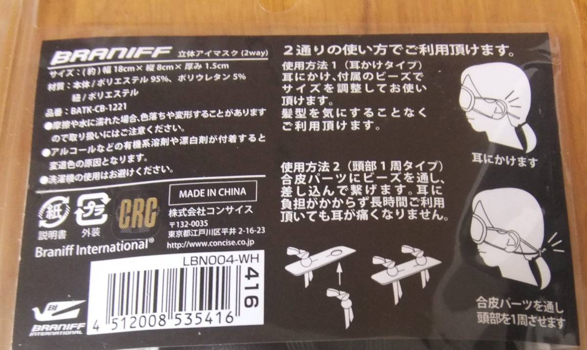 ブラニフ(BRANIFF)の立体アイマスク、新品です。定価は1080円です。