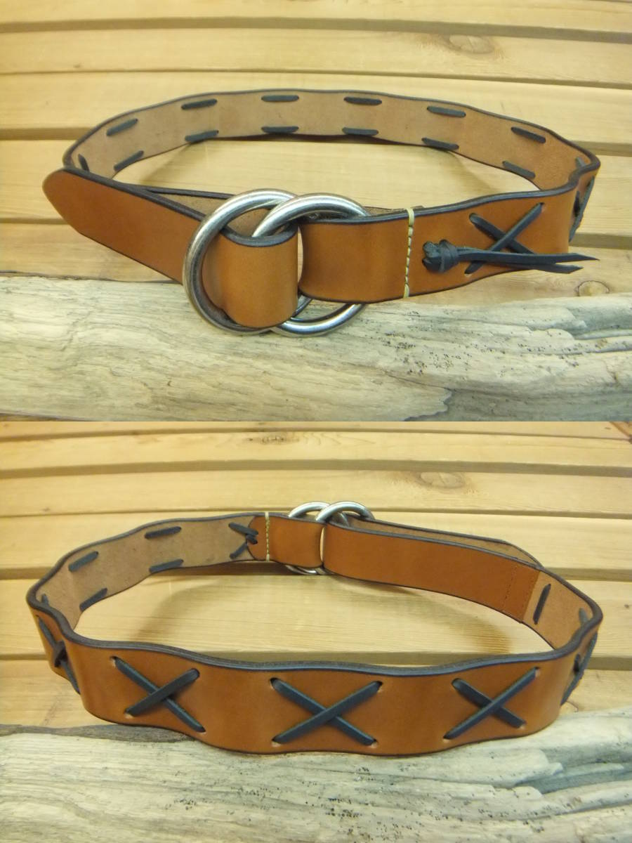 『革ヒモをクロス通しにして飾りを付けた、シンプルなベルト』