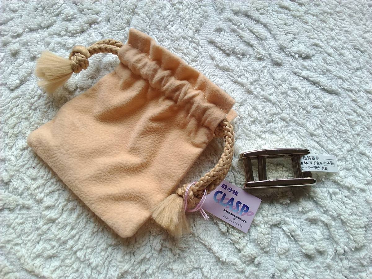 帯留めをつけるとき、後ろでしっかりとしめるのが難しいので、前でしめて回している人も多いと思います。 高価な帯に傷がついたり… 帯留めの足が欠けたり、折れてしまったり でも、背中…お太鼓の中で、結ぶのも難しい! そんな不便を解消する為に、考案された便利グッズです 三分紐もしくは四分紐をカバンなどでよく見るベルトの要領で通し、ゆるゆるのまま斜め後ろへ回し、ぎゅっと引くだけで、しっかりと帯締めをしめる事ができます 日本製でとてもしっかりとしていて、細部の仕上げまで丁寧ですので、安心してお使いいただけるのではないでしょうか 昔から存在する和装便利グッズなのですが、最近では、売っているのを見る事はほとんどないと思います。 日常的にきものを着ている人が多かった時代から、帯留め愛好家に愛用されてきたグッズです 帯留めをよくされる方や、紐をしめるのに苦労されている方、お試しくださいませ。 |