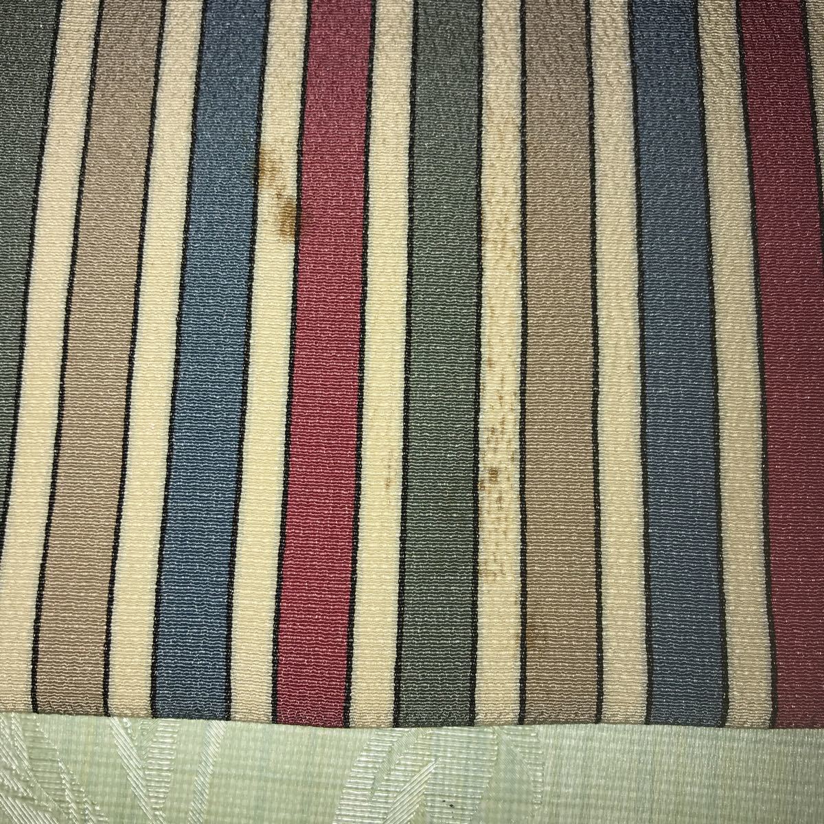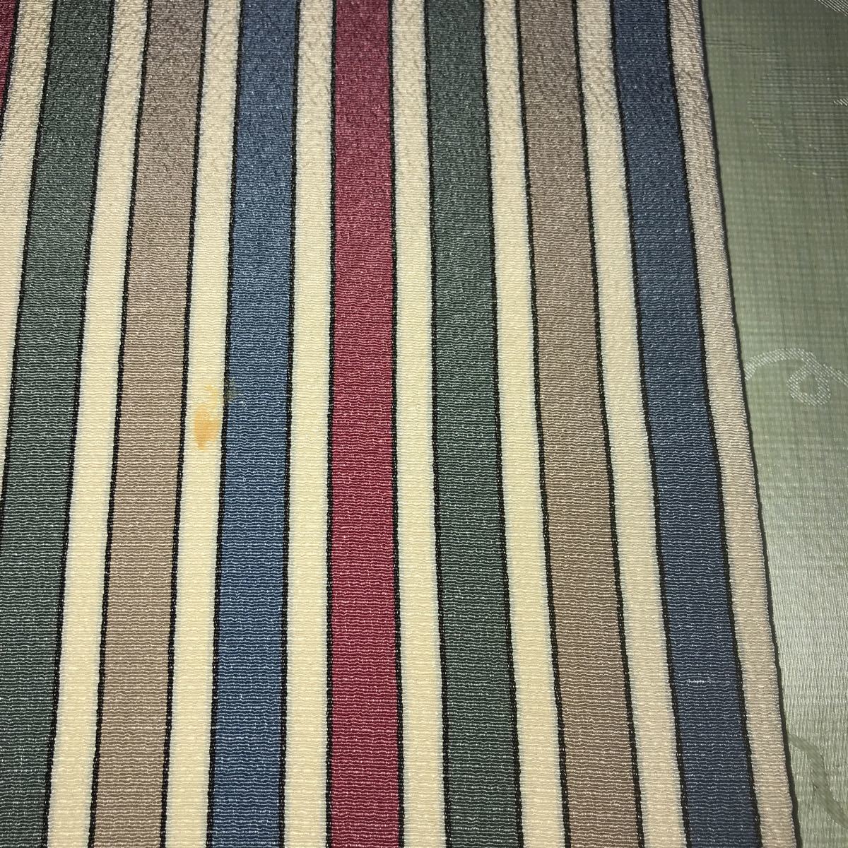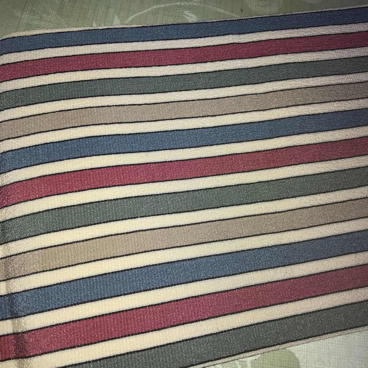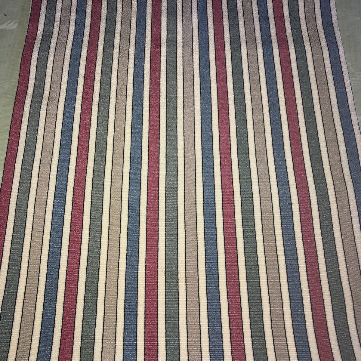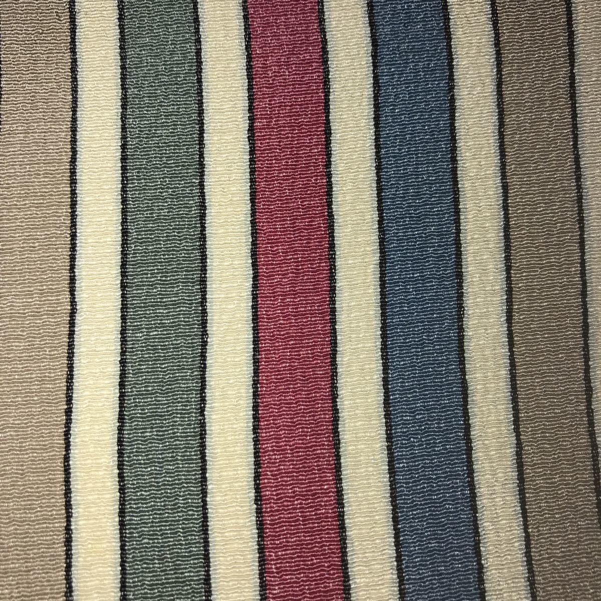 ■なごや帯 芯なし 絹?ポリエステル?縮緬風 うす紺白グレイ深緑えんじの縦線柄 単衣 薄地■