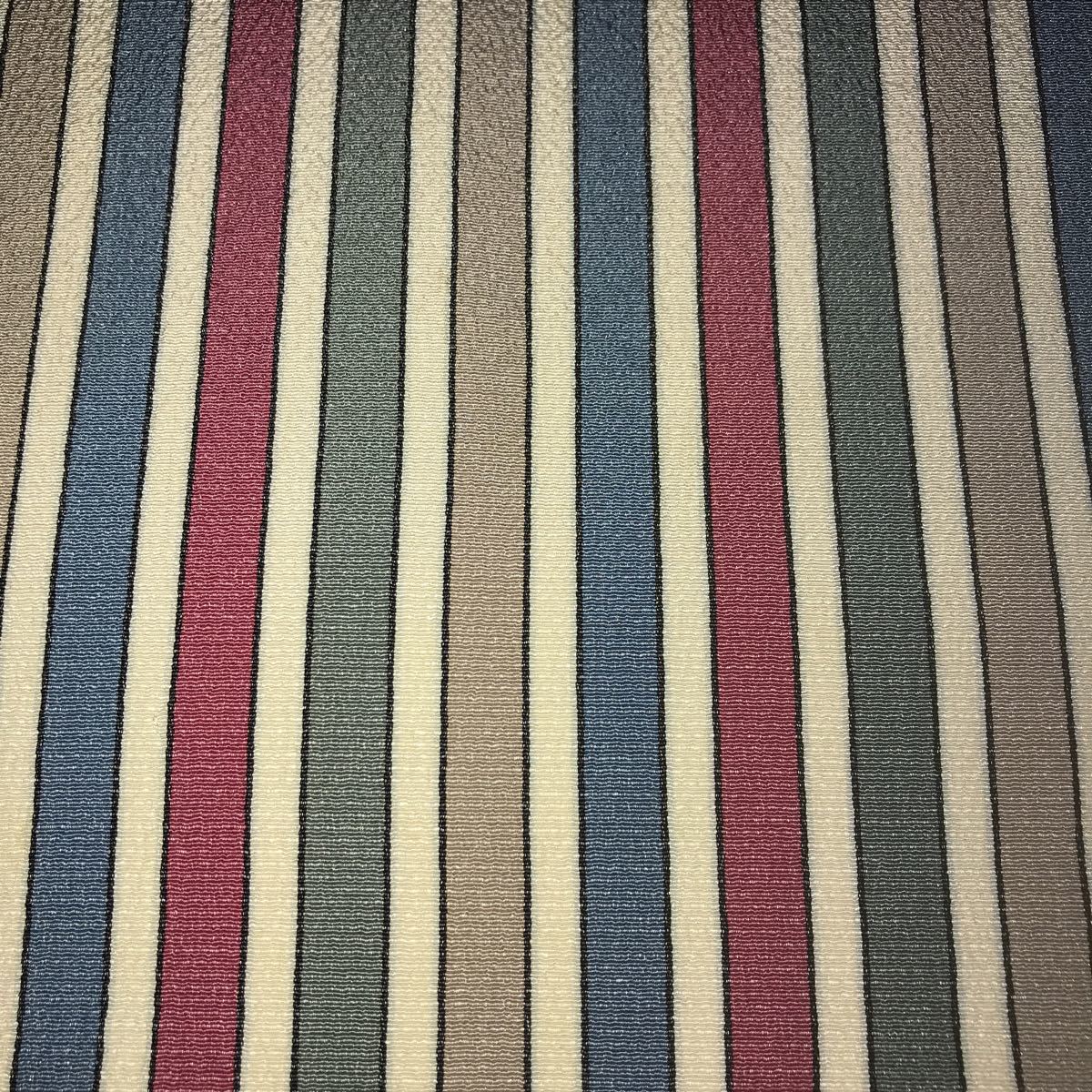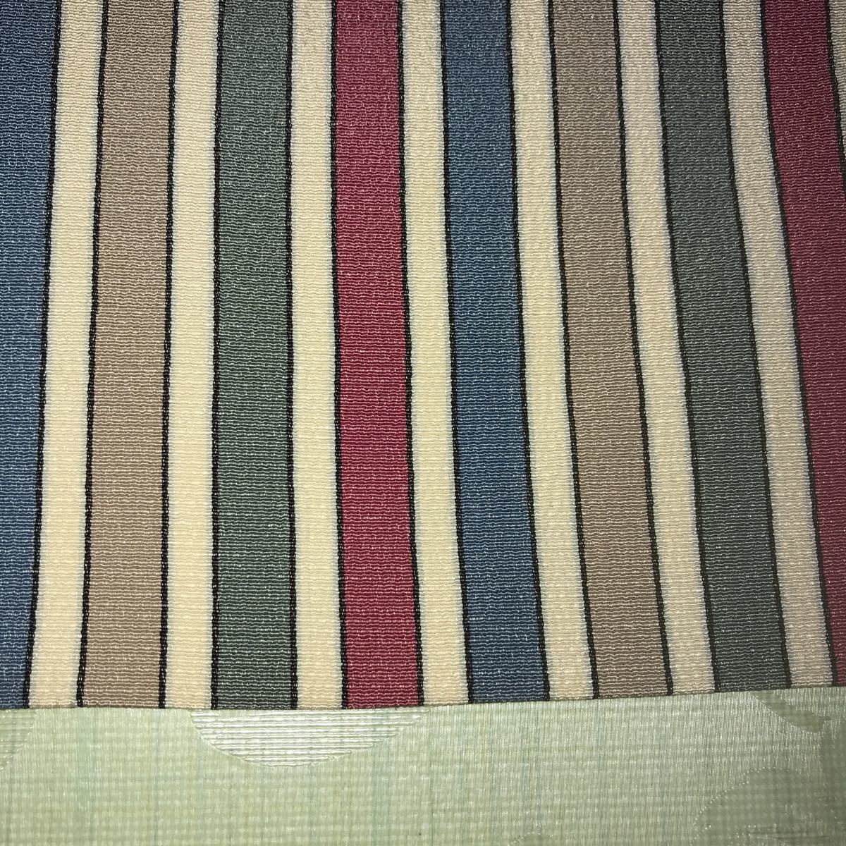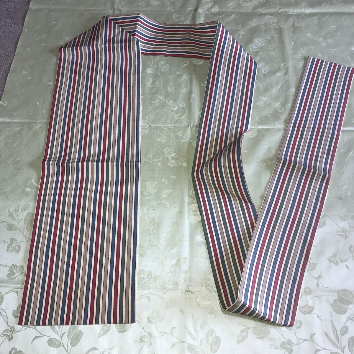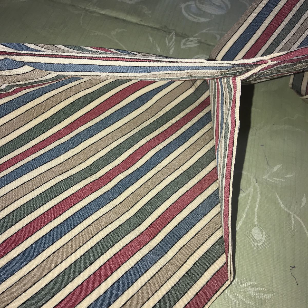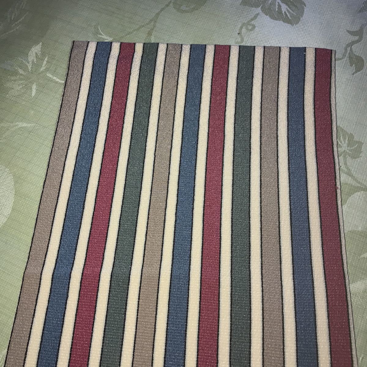 ■なごや帯 芯なし 絹?ポリエステル?縮緬風 うす紺白グレイ深緑えんじの縦線柄 単衣 薄地■