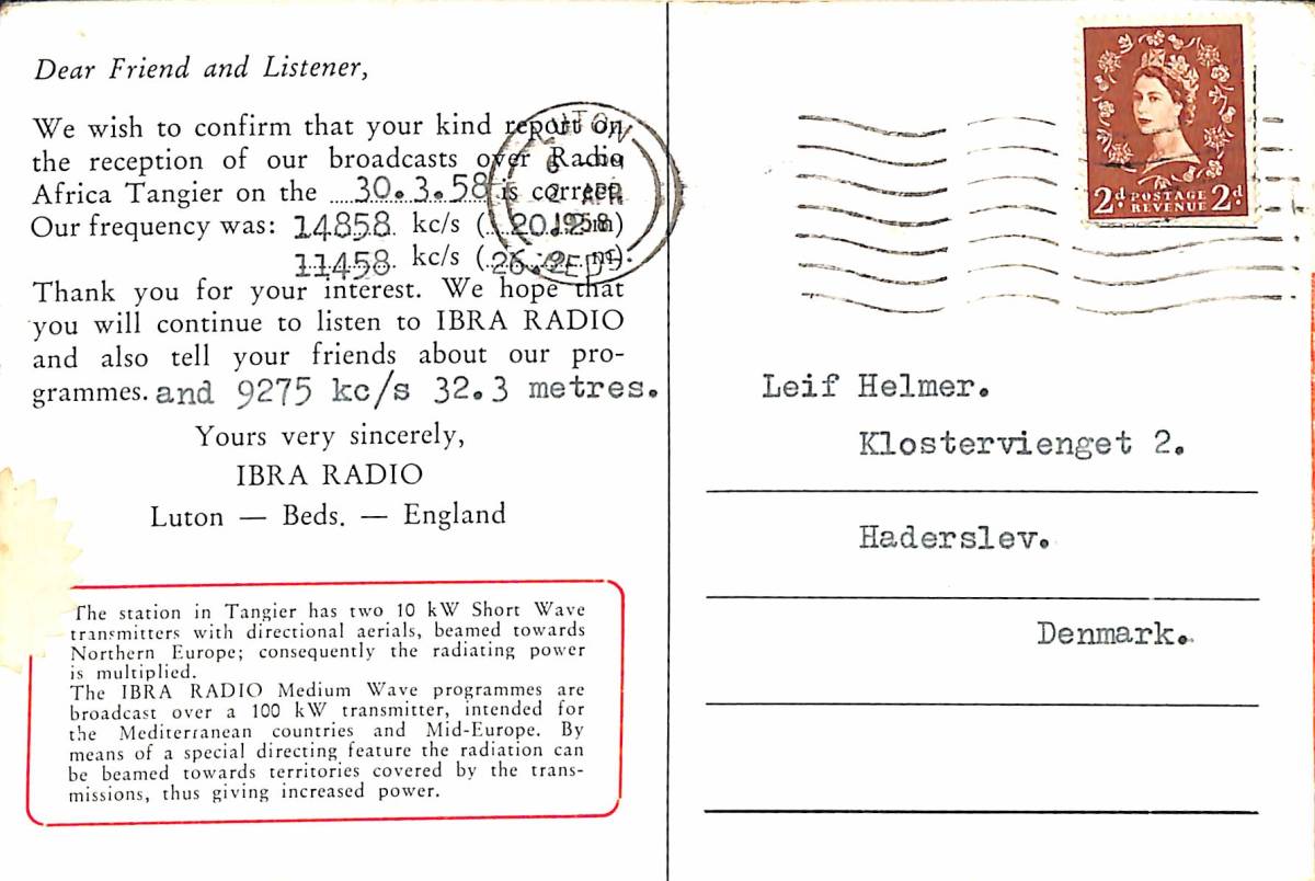 | 【商品名】・・・IBRA RADIO(★ラジオ・アフリカ・タンジール)のベリカード。 【コメント】・・・1959年末廃局になりました。入手困難なベリカードです! ■IBRA RADIO■RADIO-AFRICA-TANGER ■イブラ・ラジオの本部は、ノルウェーのオスロにありました。 【国名・地名】・・・モロッコ王国★タンジール。 【受信データ】・・・1959年★SWを受信。 【記載事項】・・・受信者の住所・氏名が記載。 【状態】・・・シワ、汚れ、シミ、焼け、色あせ等があります。 ■カードの状態は★画像を参考に判断して下さい。 ■この機会にぜひこのベリカードを貴方のBCLコレクションに加えて下さい! | |