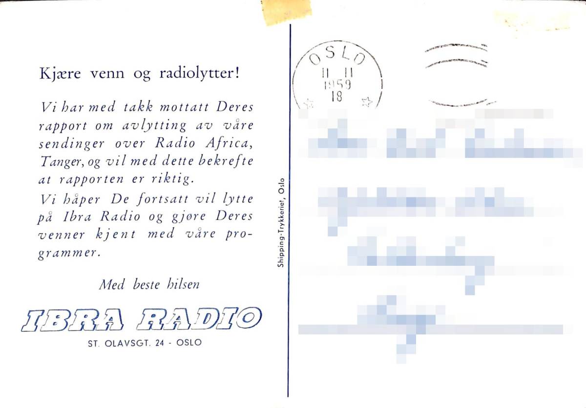 【商品名】・・・IBRA RADIO(★ラジオ・アフリカ・タンジール)のベリカード。 【コメント】・・・1959年末廃局になりました。入手困難なベリカードです! ■IBRA RADIO■RADIO-AFRICA-TANGER ■イブラ・ラジオの本部は、ノルウェーのオスロにありました。 【国名・地名】・・・モロッコ王国★タンジール。 【受信データ】・・・1959年1月★SWを受信。 【記載事項】・・・受信者の住所・氏名が記載。 【状態】・・・シワ、汚れ、シミ、焼け、テープ貼付、色あせ等があります。 ■カードの状態は★画像を参考に判断して下さい。 ■この機会にぜひこのベリカードを貴方のBCLコレクションに加えて下さい! | |