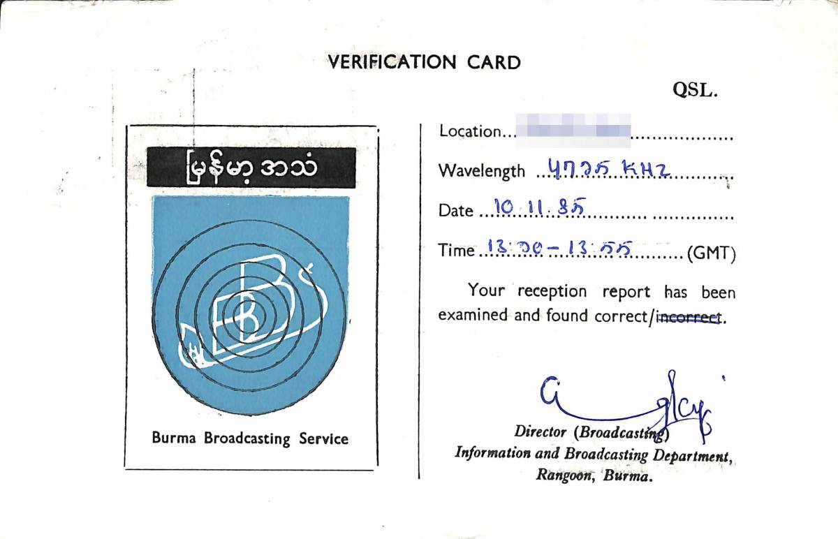 | 【商品名】・・・BURMA BROADCASTING SERVICE(★ビルマ放送)のベリカード。 【コメント】・・・現在、局名変更していて入手困難なベリカードです! 【国名・地名】・・・ミャンマー連邦共和国(★旧ビルマ)★旧首都名 ラングーン。 【受信データ】・・・1985年11月10日・SW4775KHZを受信。 【記載事項】・・・受信データ・受信者の住所・氏名が記載。 【状態】・・・シワ、汚れ、シミ、焼け、色あせ等があります。 ■カードの状態は★画像を参考に判断して下さい。 ■当方、1枚のみ所有していますので即決で落札者様のコレクションになります! ■この機会にぜひこのベリカードを貴方のBCLコレクションに加えて下さい! | |