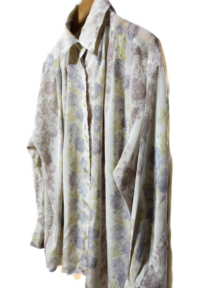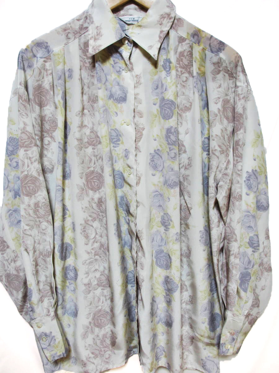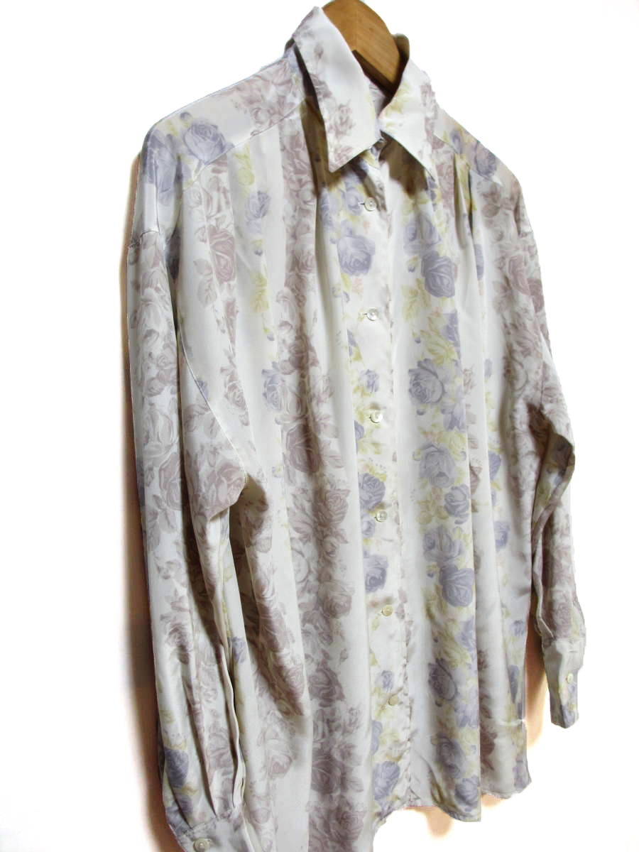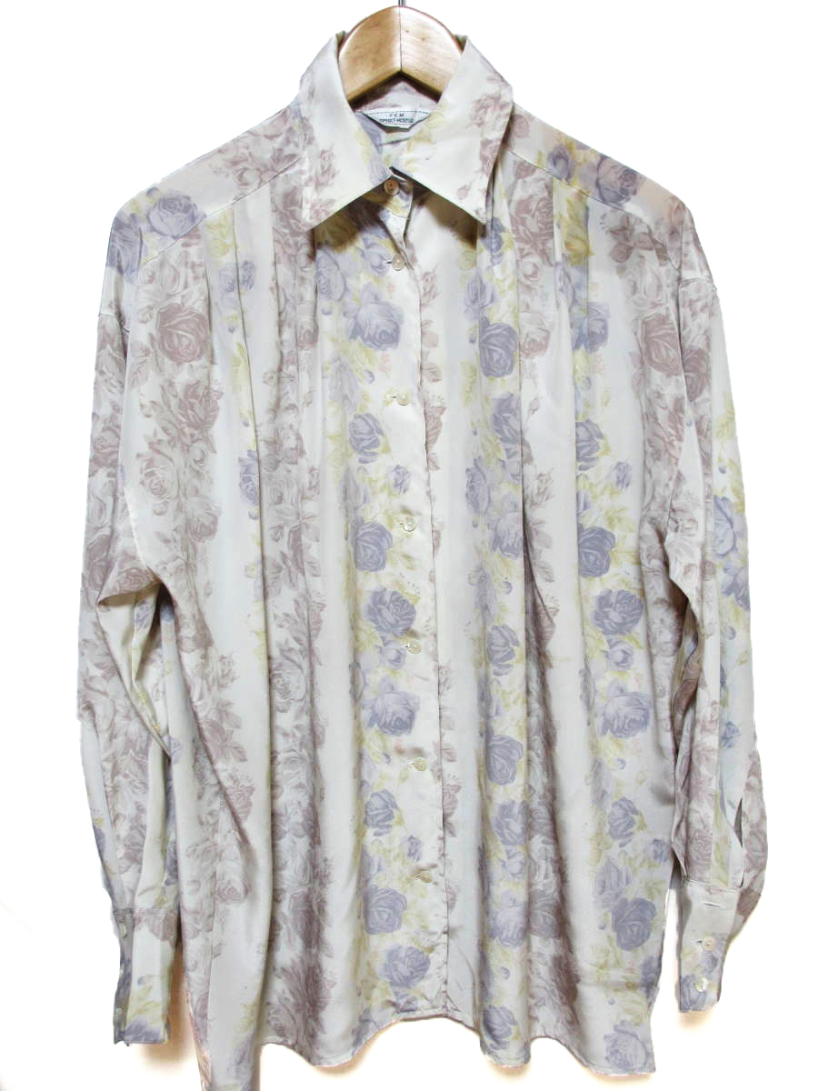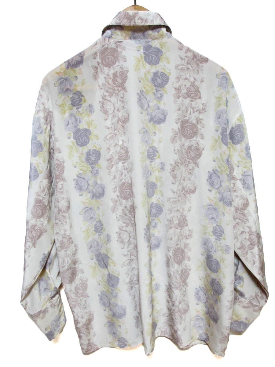 葉や枝まで細かく描かれた薔薇をストライプ柄にした珍しいモチーフのシフォンブラウスです。ベージュに薄青や緑色など全体的にやさしい色遣いでやわらかく華やかな雰囲気の品です。透け感があり、一着でフェミニンなコーディネートを完成させることができます。 【サイズ(約/㎝)】 肩幅56、身幅61、着丈72、袖丈54 ※サイズは実寸のため若干の誤差がある場合がございます。 | |