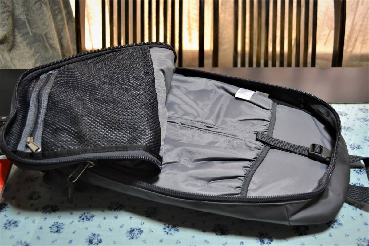 メインコンパートメントはパッド付のPCスリーブと、中が見えて取り出すのに便利なメッシュポケットを備え、セカンダリコンパートメントはポケットを備え整理整頓しやすい構造になってます。