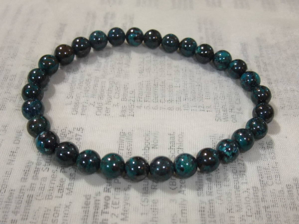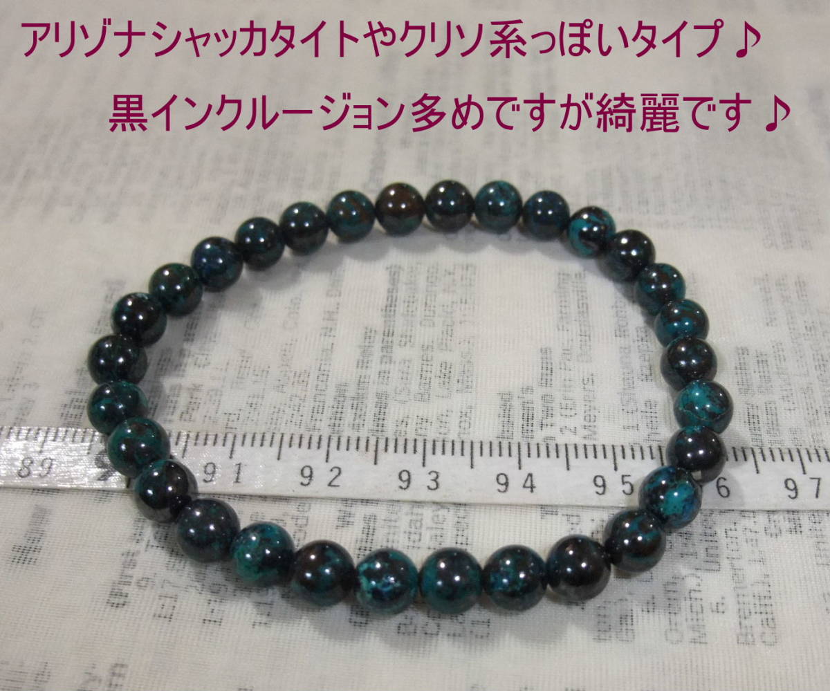酸化パイライトとアリゾナシャッカタイトっぽいインクルージョンで、コントラストがくっきりな、ややクリソコーラっぽい本ターコイズのブレスレットです♪古い連材で作製したので、産地がイマイチはっきりしないですが、アメリカ南西部系に多い特徴がかなり顕著に出たルースと思います♪少なくともアフリカ産では無いです☆スタビライズドはしていると思いますが、それを差し引いても極上とも呼べるくっきりとした鮮やかな色合いも多くとても素敵と思います♪全体的に黒めのインクルージョンがやや多い感じですが、その分、青味や翠味とのコントラストが鮮やかで本当にキレイです♪ブレスレットとしてだけではなく、ネイティブ系シルバー細工をされる方のお素材としてもとってもお得と思います♪在庫で出てきた連材で作りましたので、ルースは古いものですが高品質なお品で経年感も少なめで、ルースとしては状態はまずまず良い方と思います♪