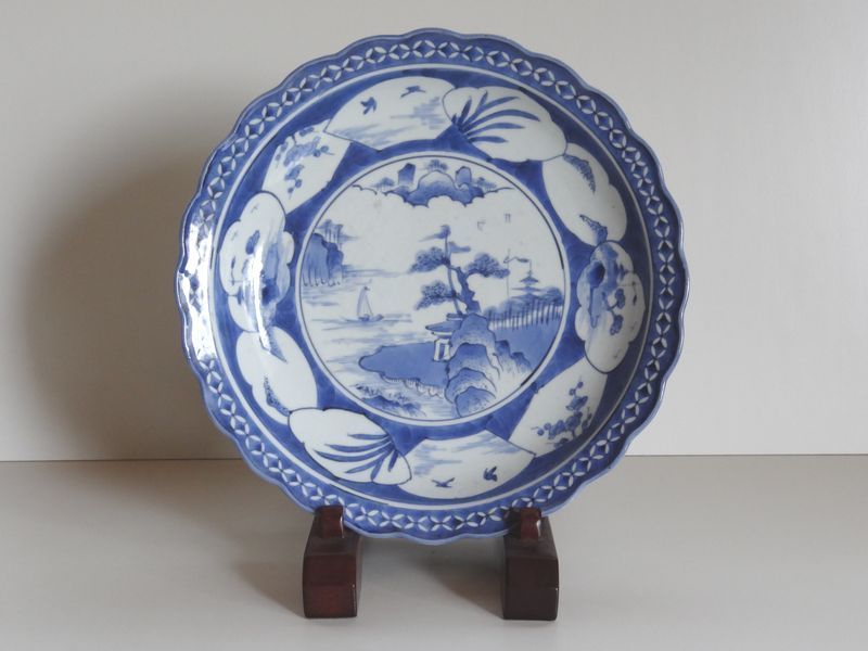 山水図が描かれた 江戸時代の古伊万里 染付皿です