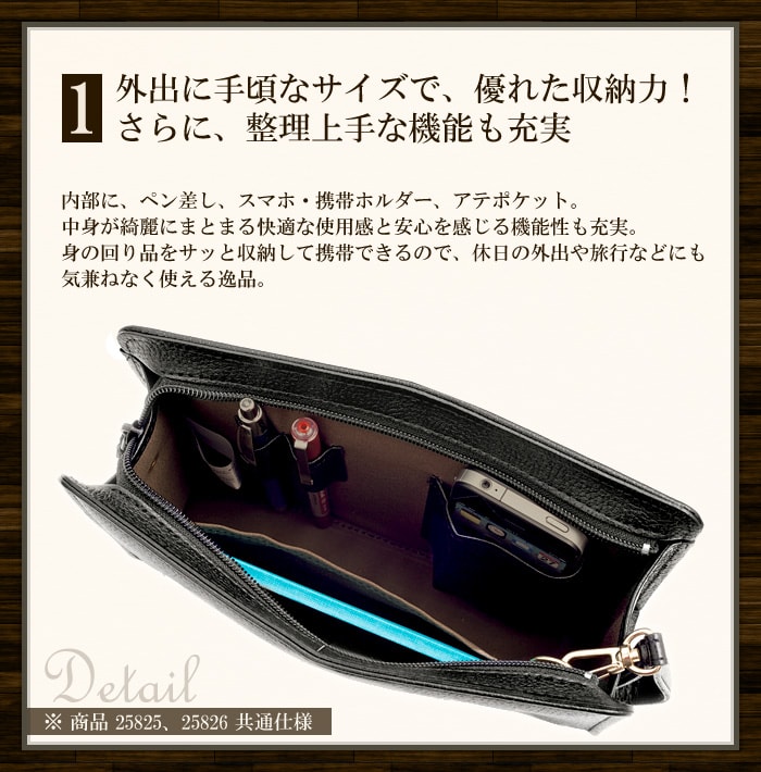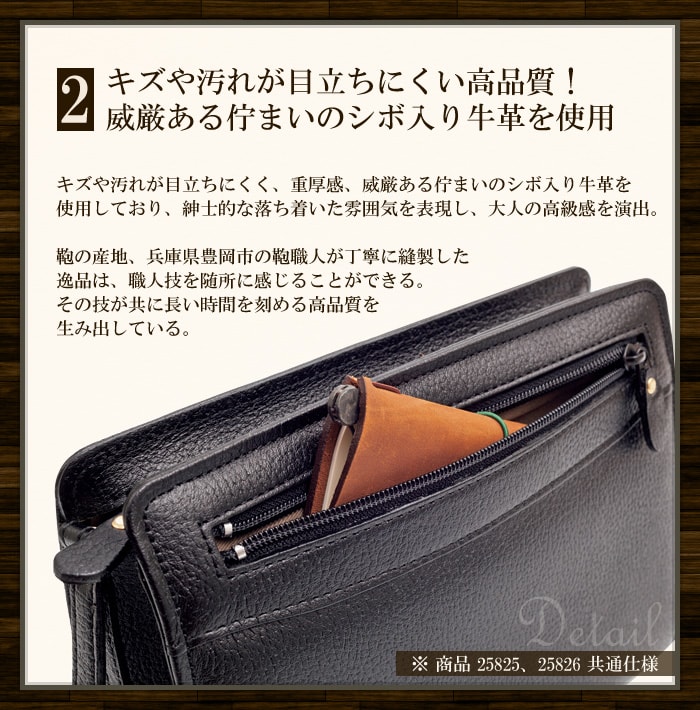 | 【 #25825 】 【セカンドバッグ/セカンドポーチ/牛革型押しシリーズ】 【ブレザークラブ/BLAZER CLUB】 "メンズ 29cm A5ファイル 牛革 型押し ループ取っ手 ビジネス フォーマル カジュアル 通勤 休日 旅行 黒" 【 商品説明 】 ◆重厚感、威厳ある佇まいのシボ入り牛革を使い、シンプルなデザインに趣をプラスした高品質な牛革ポーチ。 ◆紳士的な落ち着いた雰囲気を表現し、大人の高級感を演出。 ◆A5ファイルが収納可能。スマートフォン、財布などの身の回り品を収納できる手頃なサイズ。 ◆キズや汚れが目立ちにくいので、ビジネスやフォーマルはもちろん、休日の外出や旅行などにも気兼ねなく使えます。 ◆鞄の産地、兵庫県豊岡市の鞄職人がひとつひとつ丁寧に縫製した職人技が共に長い時間を刻める高品質を生み出してます。 ◆父の日、敬老の日、バレンタイン、クリスマス、誕生日などのプレゼントに最適! 【 商品詳細 】 サイズ : 横幅29×高さ20×厚み7 [cm] 重量 : 約440g 素材 : 牛革 カラー : 01-黒 生産国 : 日本製(兵庫県豊岡市で生産) 本体正面 : ファスナーポケット 本体内部 : スマホ・携帯用ホルダー、アテポケット、ペン差し その他 : ループ取っ手付き ※ 予告なく仕様変更する事がありますのでご了承下さい。 ◆牛革製品のお取り扱い上の注意 ・革は水分に大変弱く、シミ・水ぶくれの原因となります。また多少の色落ち、色移りがありますのでご注意下さい。 万一、雨や水に濡れた場合は、すばやく乾いたやわらかい布で水気を取り、形を整えて必ず陰干しして下さい。 ・軽い汚れは、乾いたやわらかい布で乾拭きして下さい。 ・汚れたまま高温・多湿の状態で保存しますとカビの原因となります。 汚れ・ほこりを払い、通気性のある布などに包んで風通しの良い場所に保管して下さい。 ・他の革製品やビニール素材と密着して長時間保管しますと色移りの原因となりますのでご注意下さい。 ・お手入れには必ず素材に合った専用クリーナー、クリームをご使用下さい。 | |