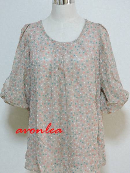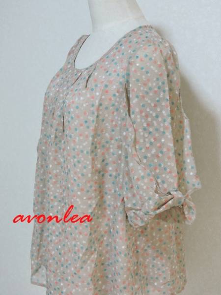 水玉模様 チュニック ベージュ系 リボンスリーブ カラフルドット M~L ゆったりタイプ(リボン袖/トップス/7分袖