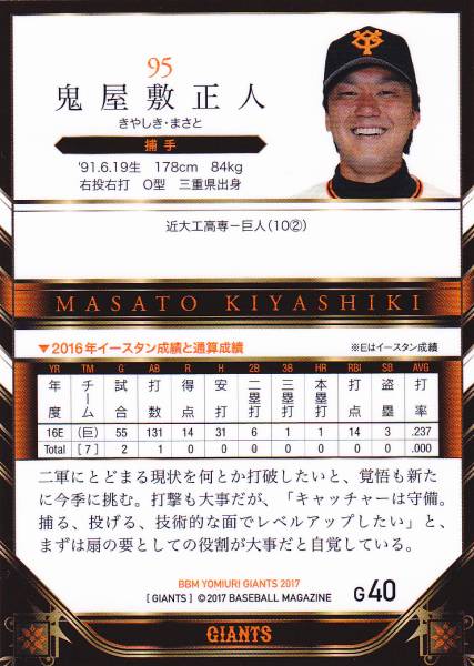 BBM 読売ジャイアンツ ベースボールカード2017 G40 鬼屋敷正人 巨人 三重県 近畿大学工業高等専門学校