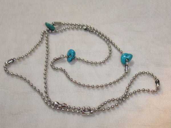 画像の、日本製の古いボールチェーン、キーホルター用のものを、つないで、なんと本ターコイズの大穴開けのものを3個、通してネックレス状に仕上げてみました♪