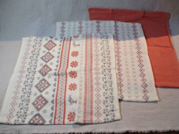 | 商品紹介 | ガーゼミニタオルの3枚セットです。 1枚はピンクの無地、 1枚はキナリの地色のグレーとくすんだ青・赤でバツ印と菱型の模様が入った物、 もう一枚はキナリの地色にピンクを中心としたトリ等の柄が入っています。 【素材】 コットン100% |