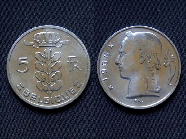 【ベルギー】 5フラン Fr 1968年 白銅貨