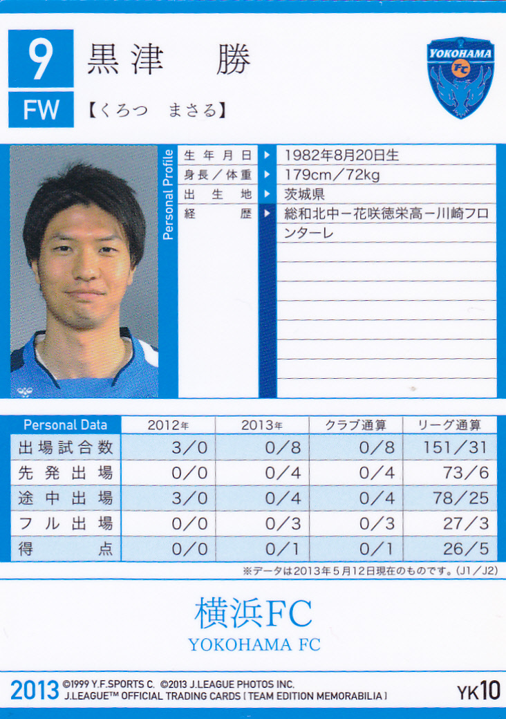 横浜FC2013 YK10 黒津勝 Jリーグオフィシャルトレーディングカード チームエディションメモラビリア 総和北中 花咲徳栄高