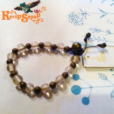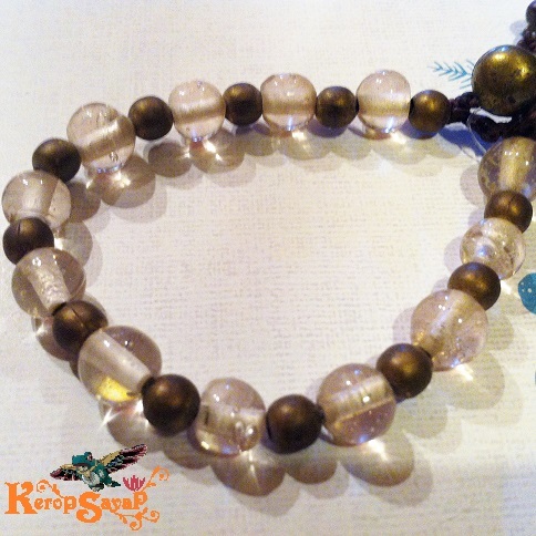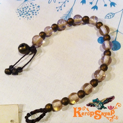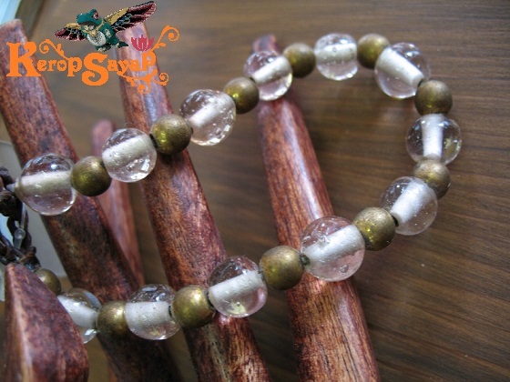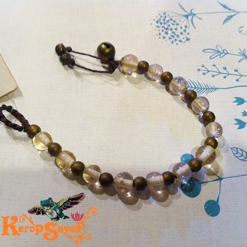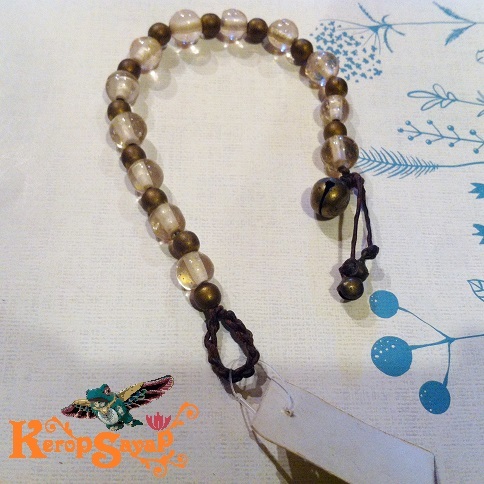 涼しげガラスビーズ鈴付ブレスレット 薄ピンク アジアンエスニックヒッピー♪ タイ雑貨 ブラス真鍮アンティーク色ワックスコード