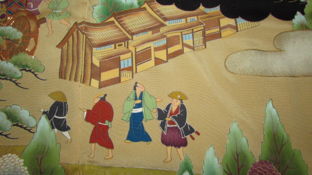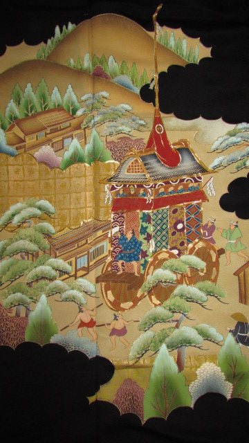 1000円値引き(着物屋・蔵出し)(古布・祇園祭風景模様刺繍留袖・比翼付き)珍品
