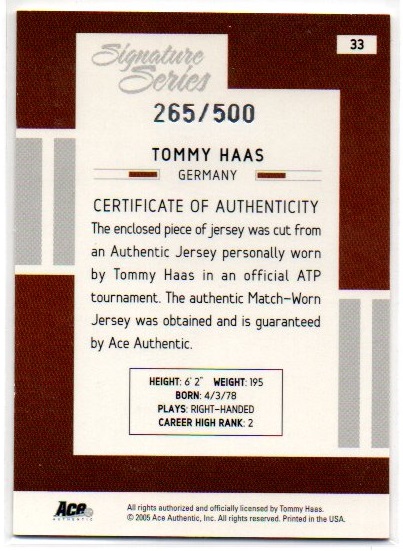 【TOMMY HAAS】TENNIS 2005 Ace Authentic Signature Series Jersey 265/500