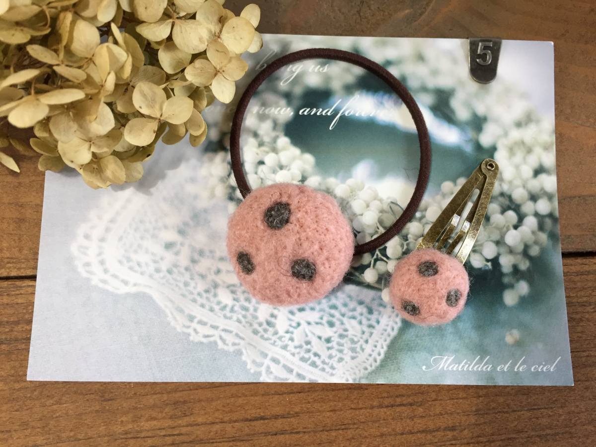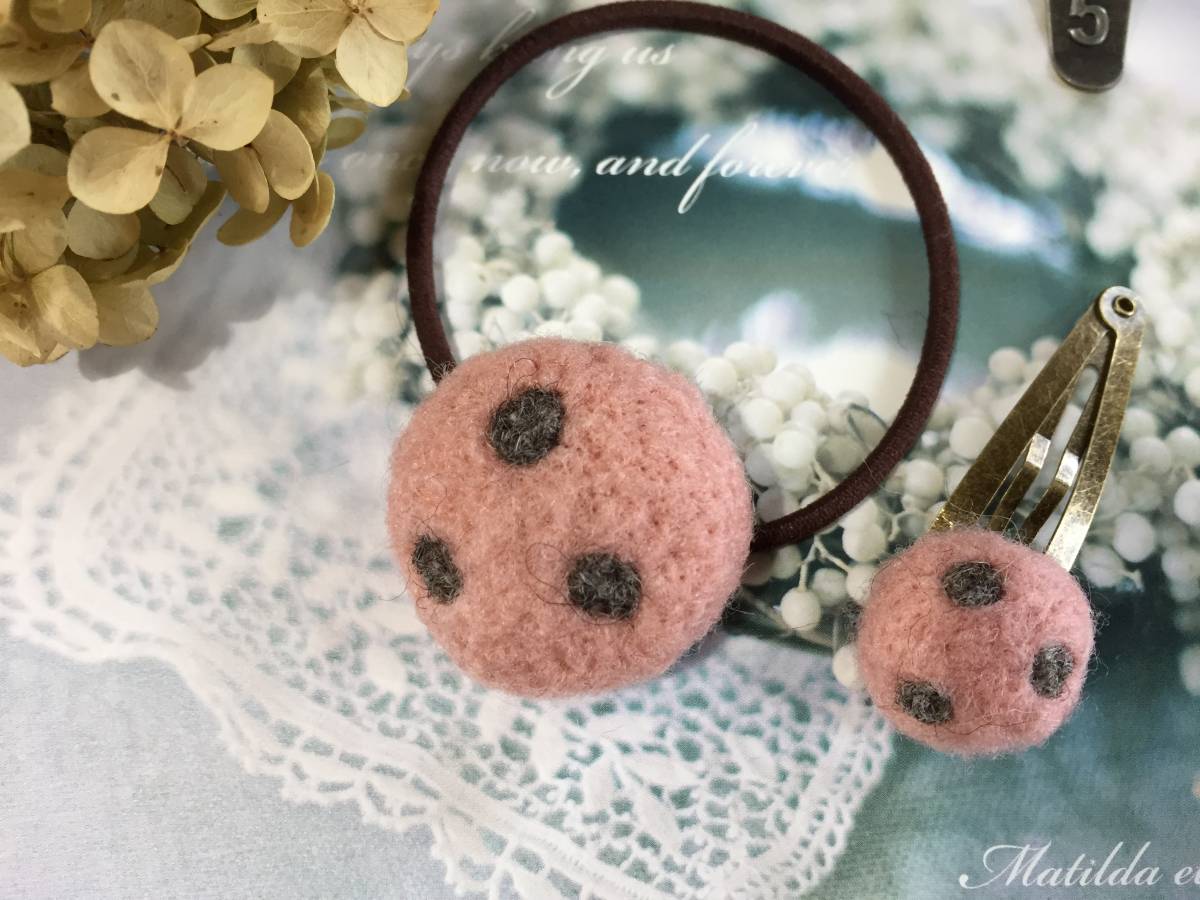 羊毛フェルトで水玉柄ヘアゴムとヘアピンのセットを作りました。