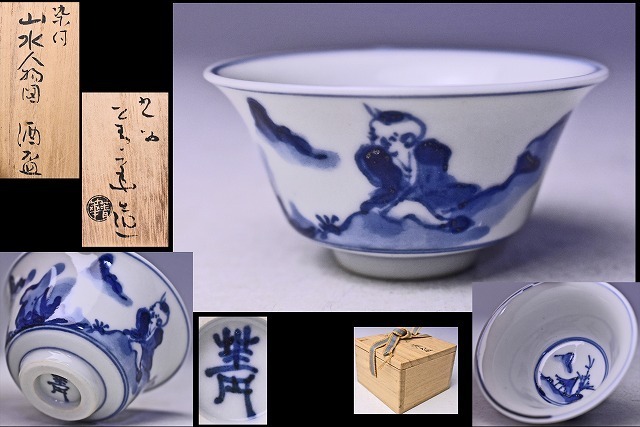 須田菁華 ★ 染付山水人物図ぐい呑 ★ 共箱 ★ やわらかなタッチで描く ★ 九谷焼 ★ 須田青華 ★ 呉須の濃淡