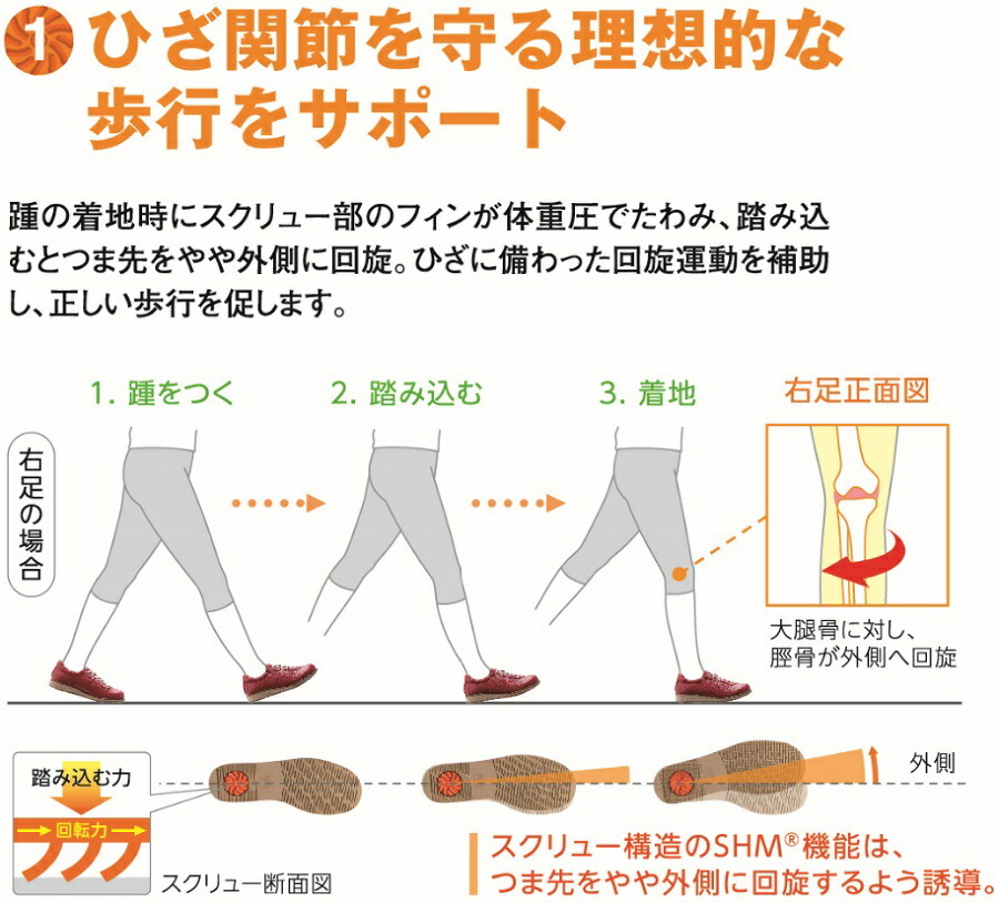 ・ひざへの衝撃を分散吸収、ひざを安定させ、ももの内側の筋肉を有効活用します。
