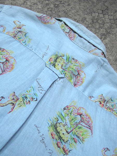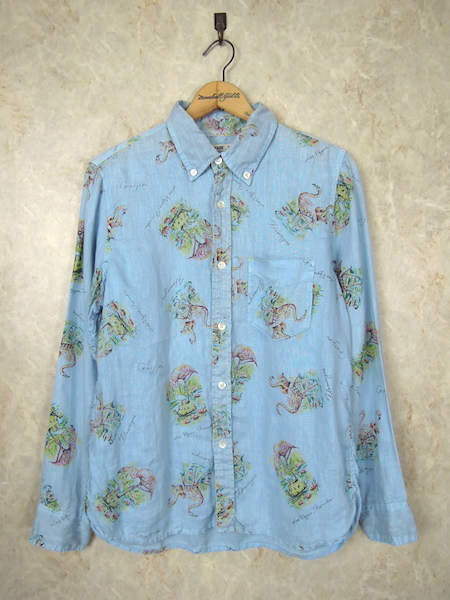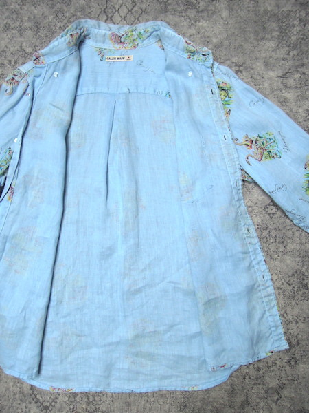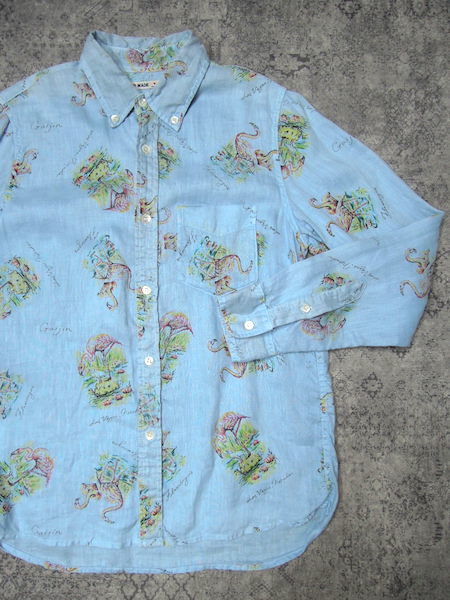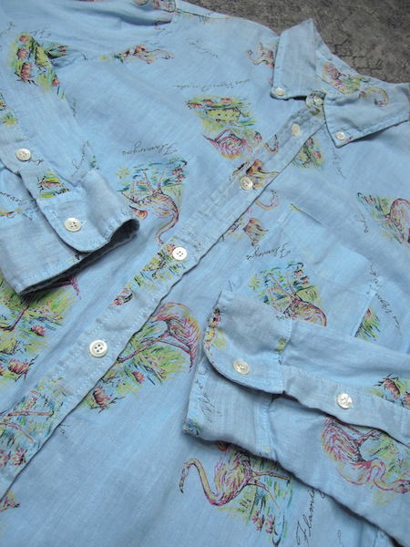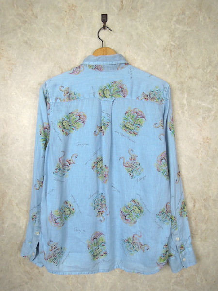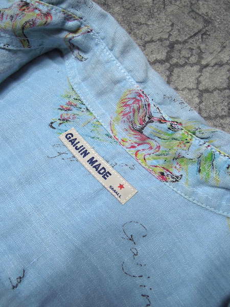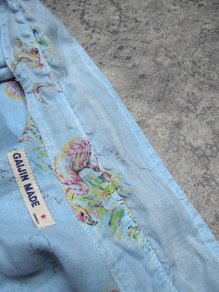 ガイジンメイド 総柄リネンシャツ●メンズSサイズ/水色/ロングスリーブ/フラミンゴ柄/麻/長袖/GAIJIN MADE/ハリウッドランチマーケット