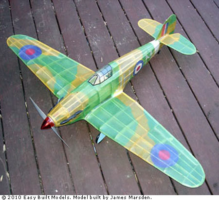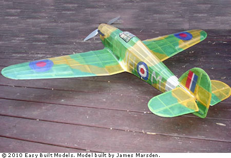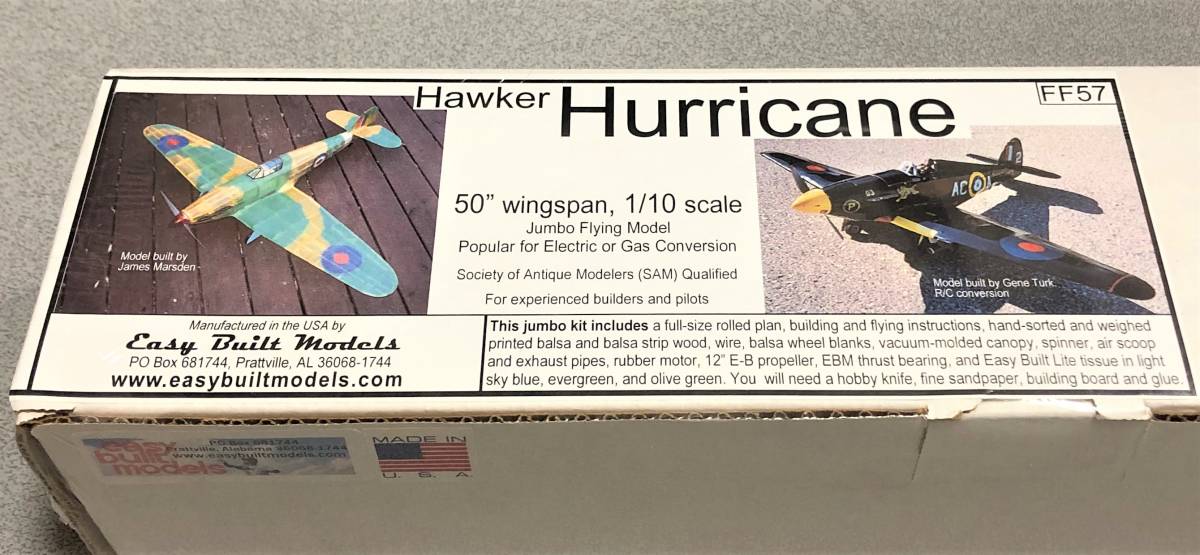 Easy Built製のハリケーンで、翼長は、約1270mm、の出品です。ゴム動力機ですが、電動化も検討願います。バルサパーツは、プリント板の切り抜きです。(カットはされておりません。)