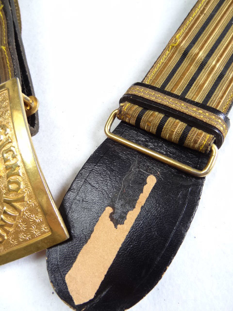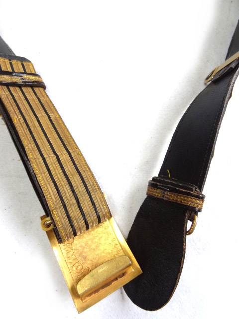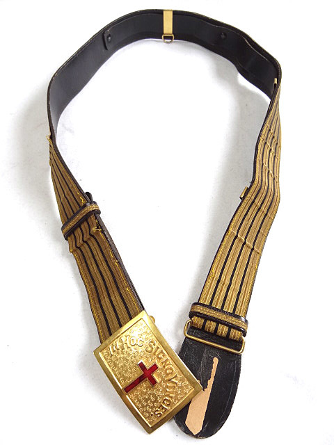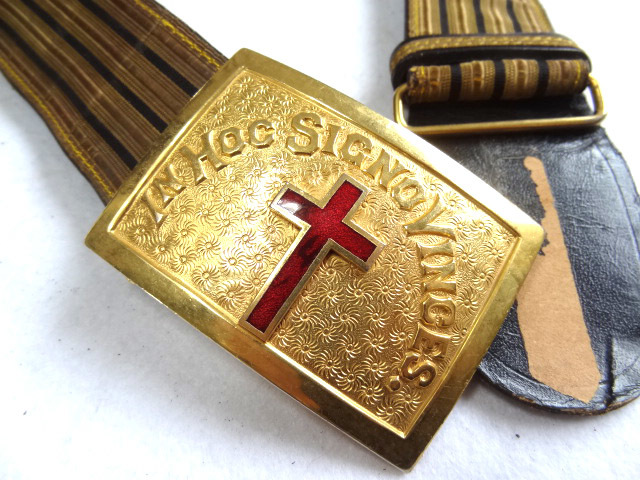 ⑱ ビンテージ フリーメイソン 秘密結社 黒糸 金糸 布 革 レザー ベルト 真鍮 赤 クロス スクエア バックル レア 希少 ソード チェーン 柄