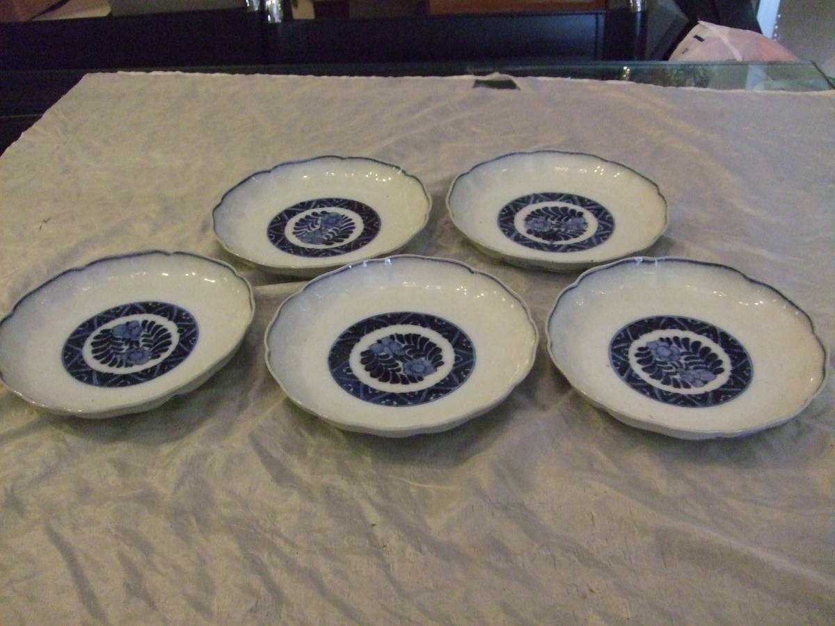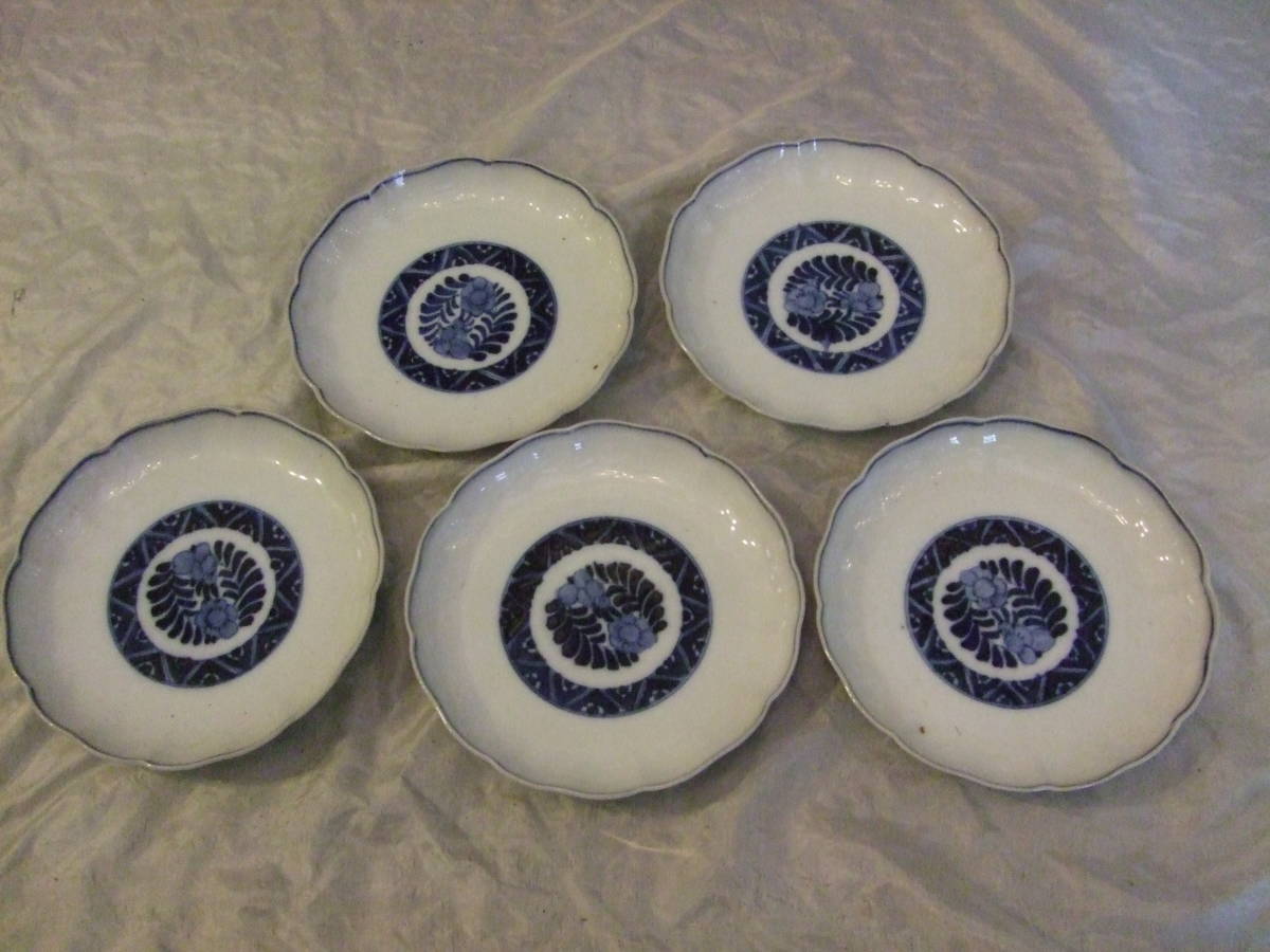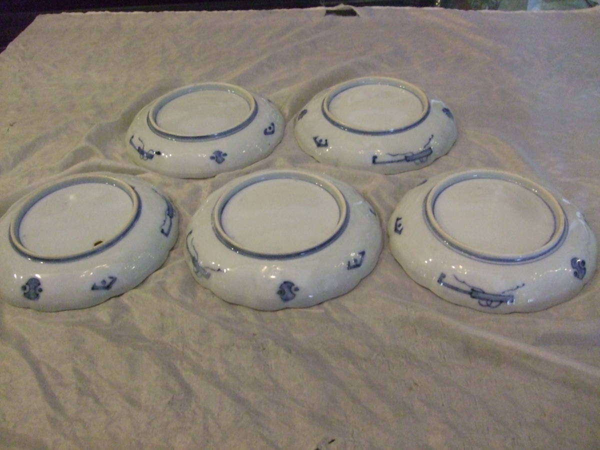 ■古伊万里 染付 花割吉祥紋 皿5枚組 江戸中期 18,5㎝ 骨董皿 蔵出し物 懐石 和食器■
