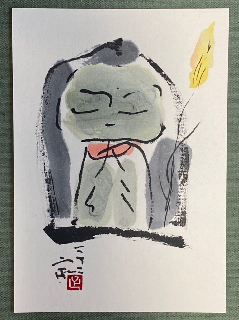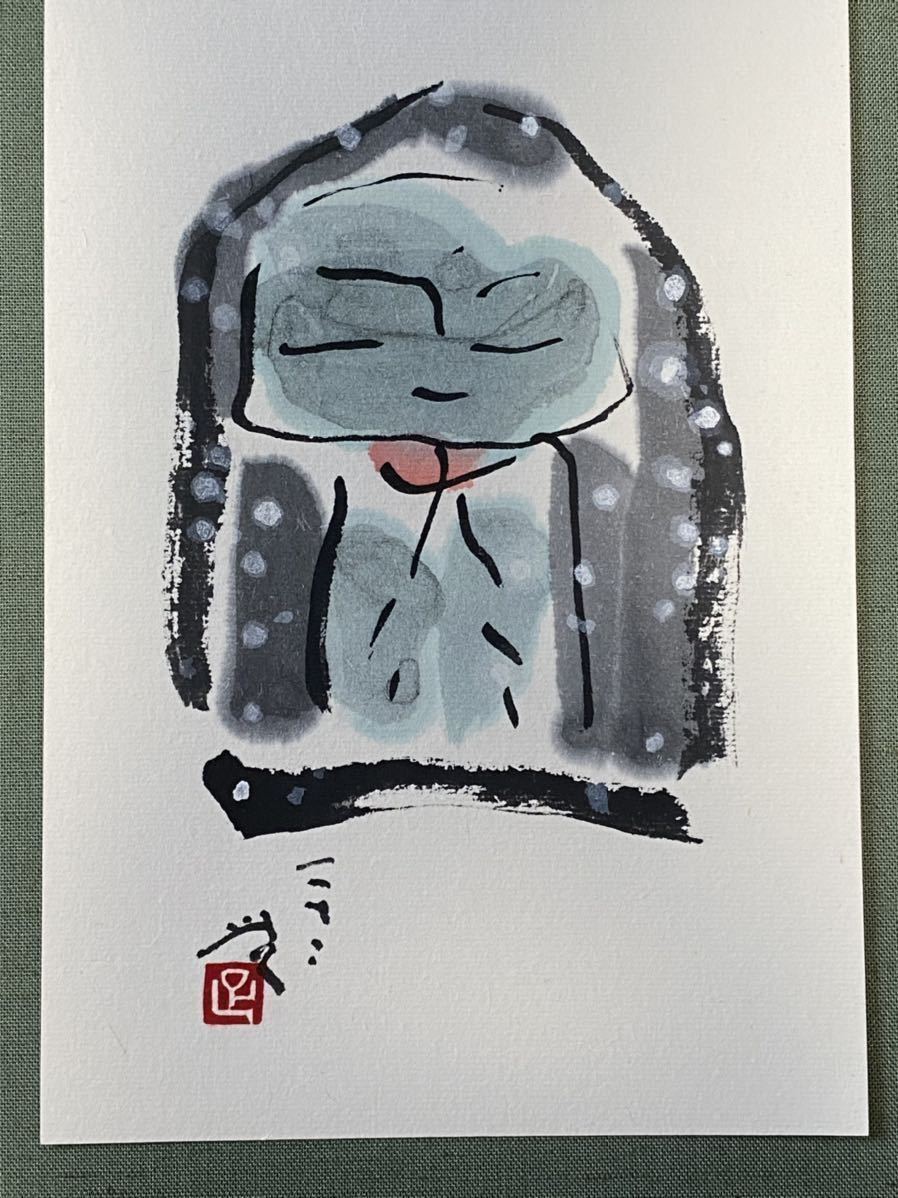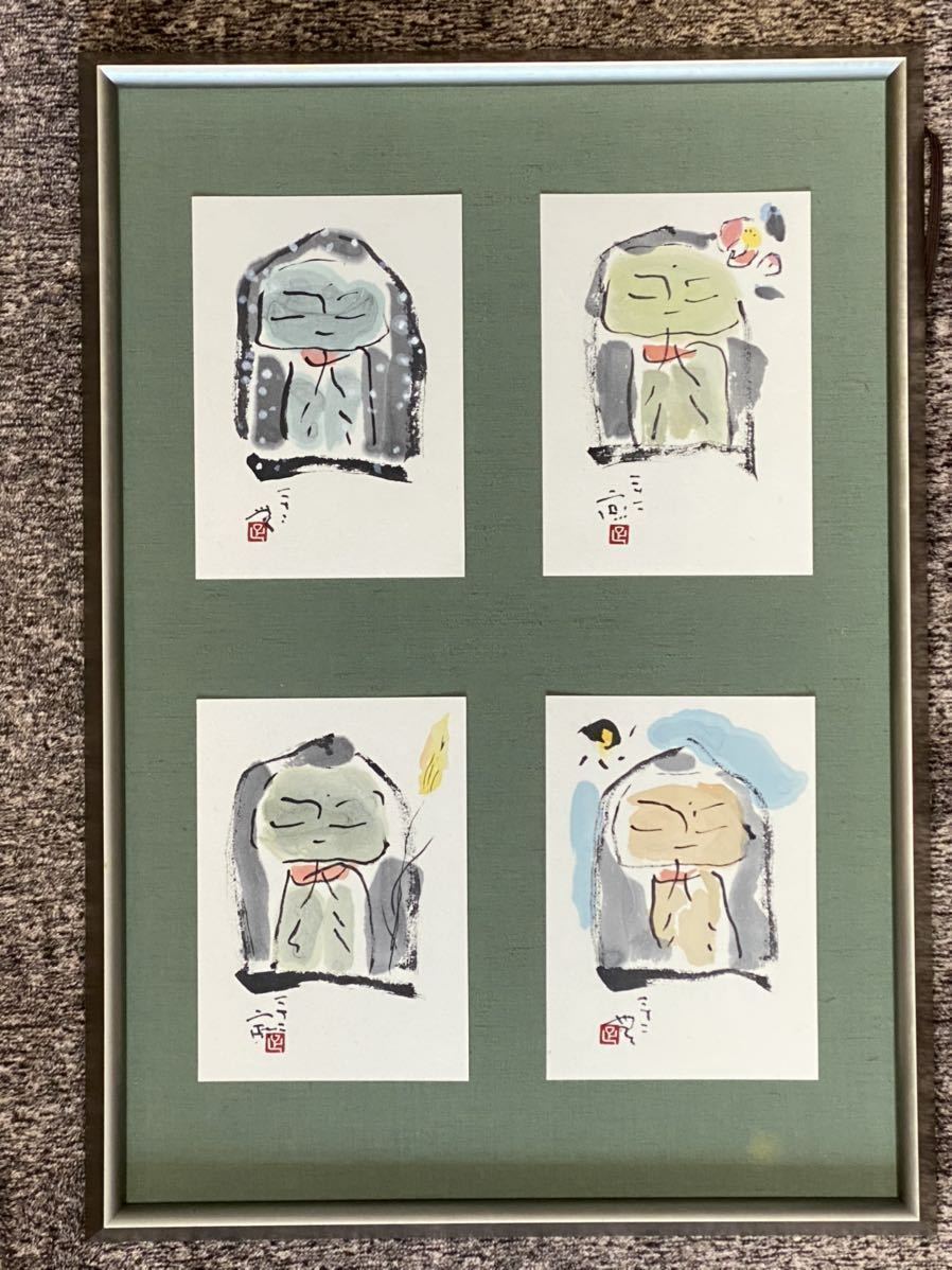 花に囲まれた春、太陽が燦々と降りそそぐ夏、実りの秋、そして雪が深々と降りそそぐ冬。暑い時も寒い時も嬉しい時も楽しい時も微笑みを絶やさず私たちを見守ってくれている『お地蔵さん』を描いた瀬戸内寂聴の水彩画です。大きさは額寸法が縦約54.0センチ横約38.5センチ。作品1枚の大きさが縦約17.3センチ横約12.0センチ。作品にシミや焼け、シワや破れはありませんが右下のマット部分に小さなシミが見受けられます。額はアルミ枠アクリル板。署名、落款がなされています。印刷ではありません。