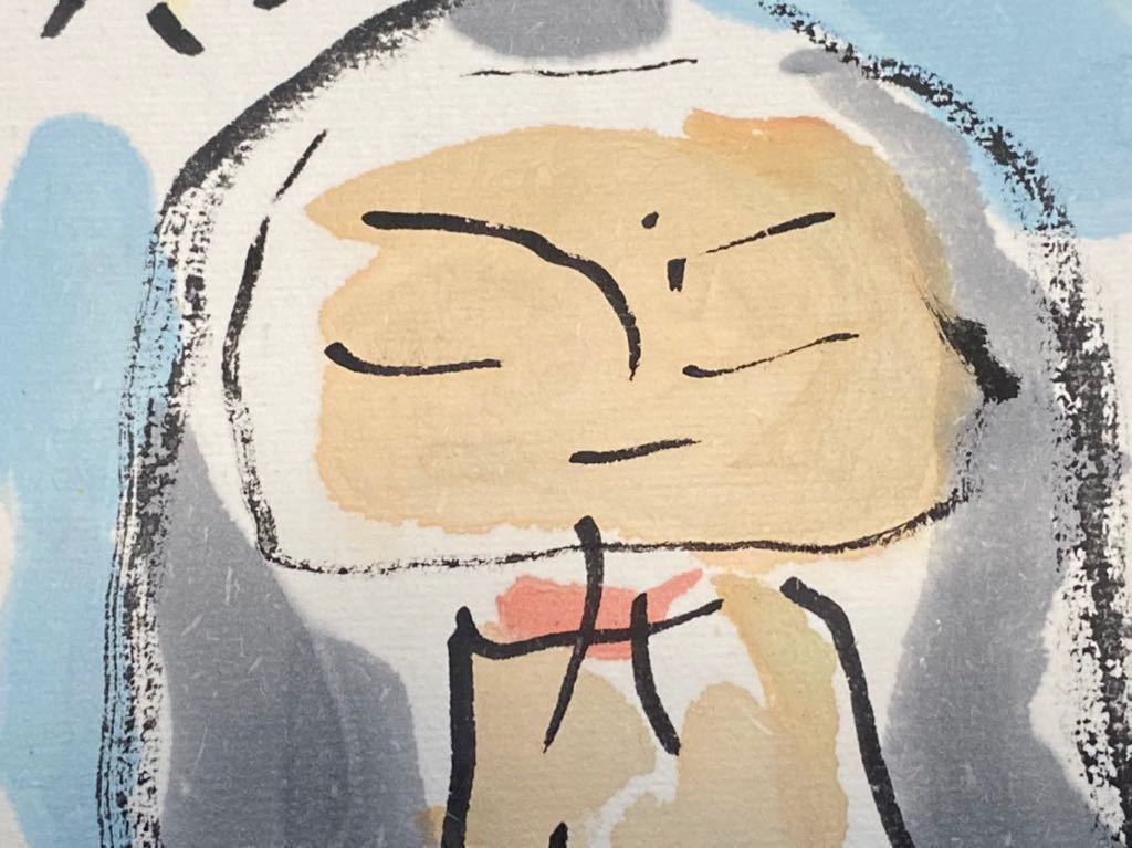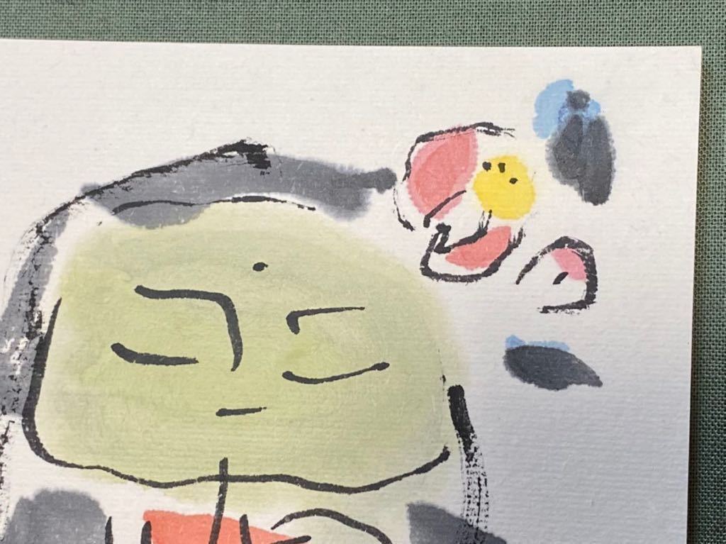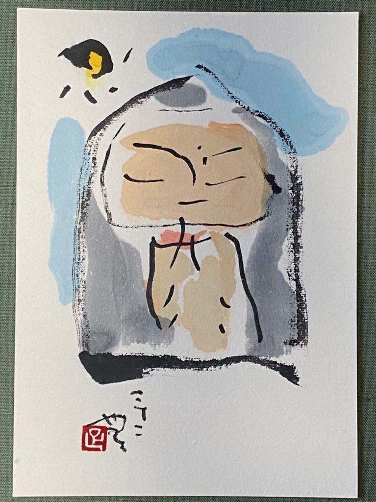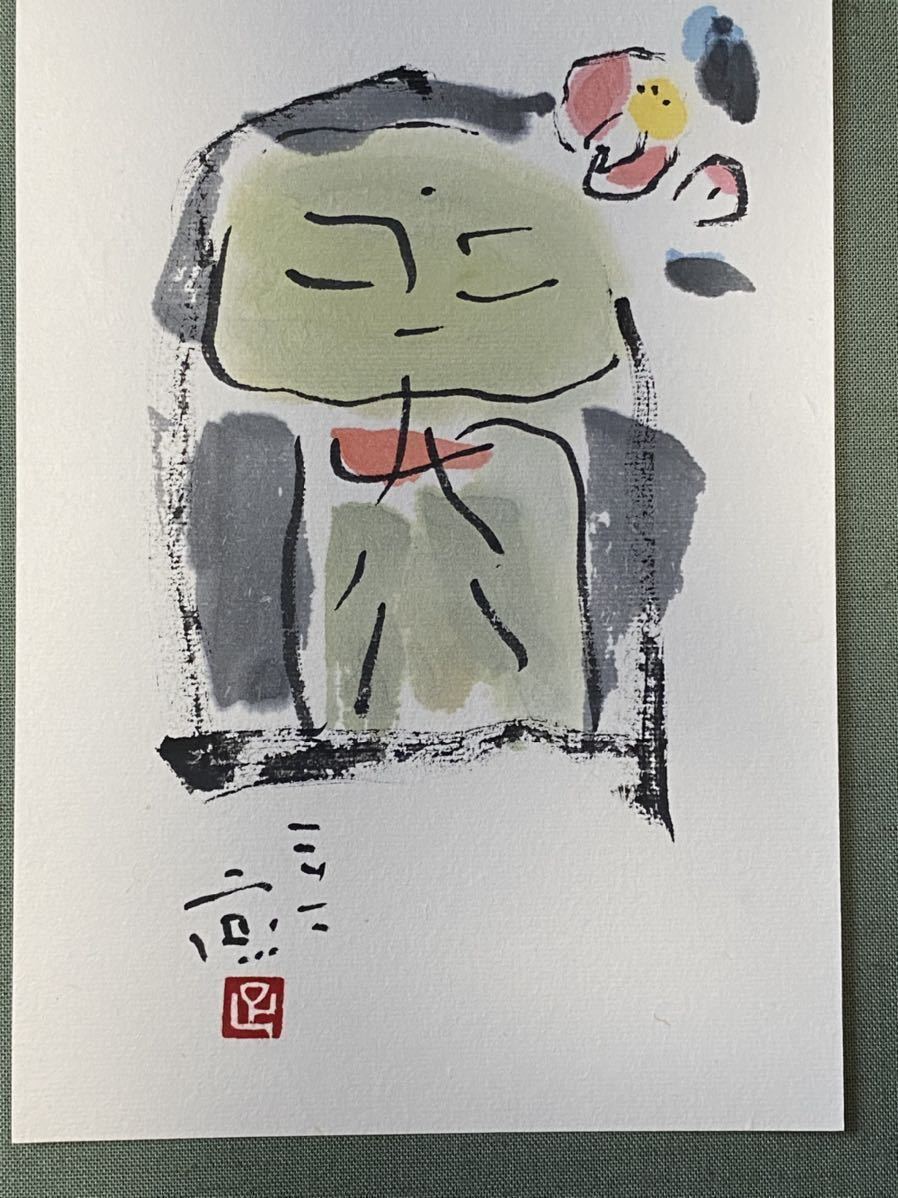 花に囲まれた春、太陽が燦々と降りそそぐ夏、実りの秋、そして雪が深々と降りそそぐ冬。暑い時も寒い時も嬉しい時も楽しい時も微笑みを絶やさず私たちを見守ってくれている『お地蔵さん』を描いた瀬戸内寂聴の水彩画です。大きさは額寸法が縦約54.0センチ横約38.5センチ。作品1枚の大きさが縦約17.3センチ横約12.0センチ。作品にシミや焼け、シワや破れはありませんが右下のマット部分に小さなシミが見受けられます。額はアルミ枠アクリル板。署名、落款がなされています。印刷ではありません。
