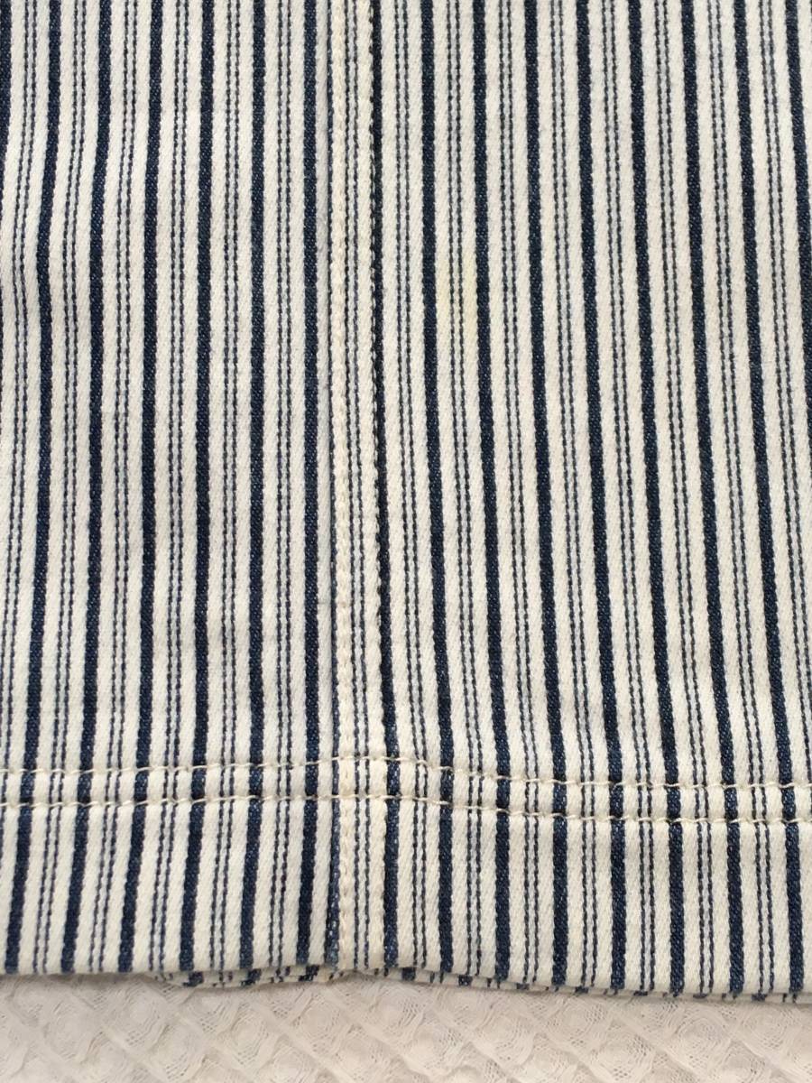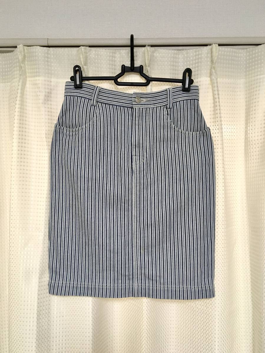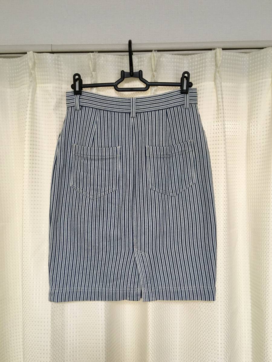 デザイン:ひざ丈のタイトスカートで、ベーシックなヒッコリーデニムのデザインです。裏地はついていませんが、生地の裏側パイル状になっていて肌にはりつきにくいです。日本製デニムです。