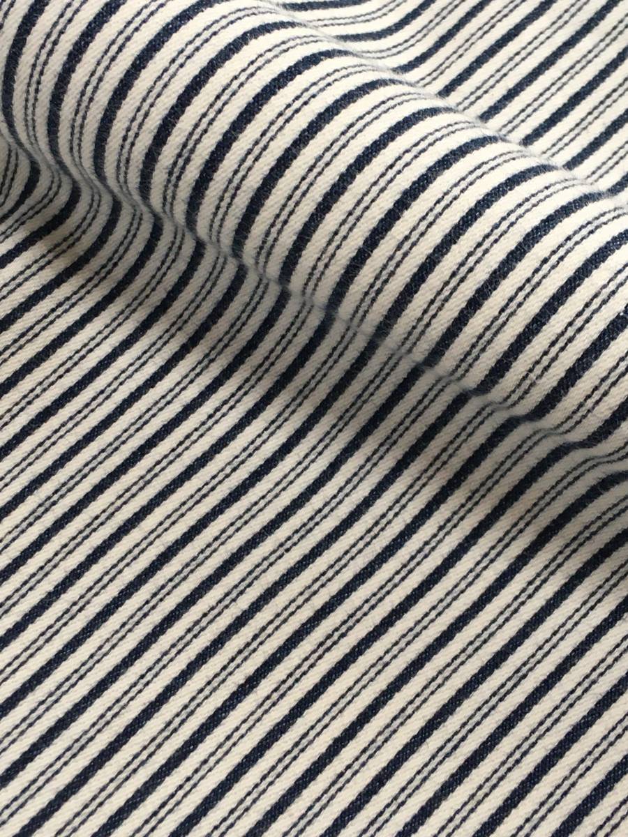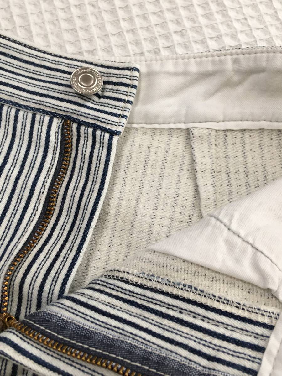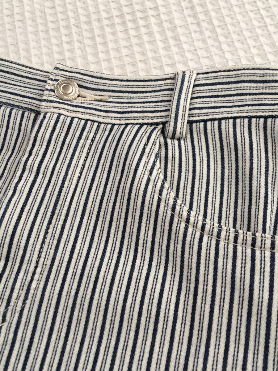 デザイン:ひざ丈のタイトスカートで、ベーシックなヒッコリーデニムのデザインです。裏地はついていませんが、生地の裏側パイル状になっていて肌にはりつきにくいです。日本製デニムです。