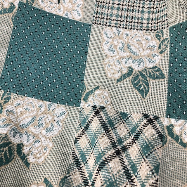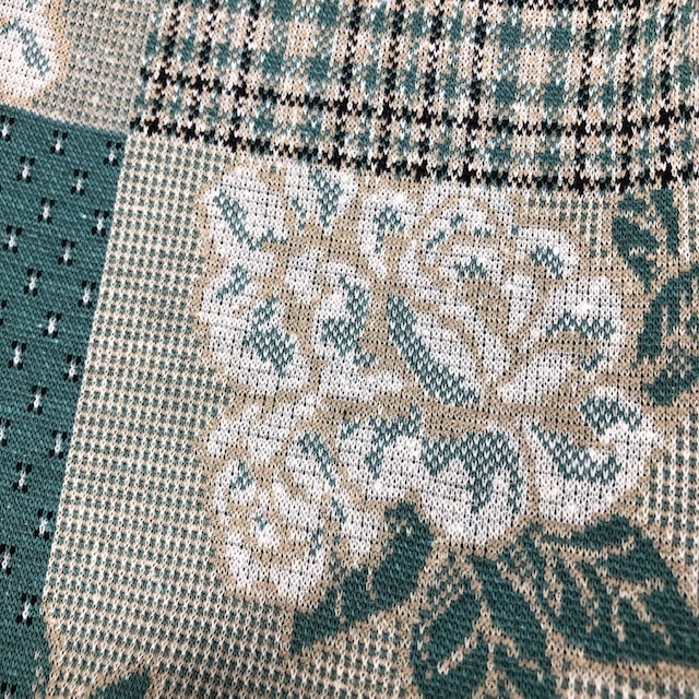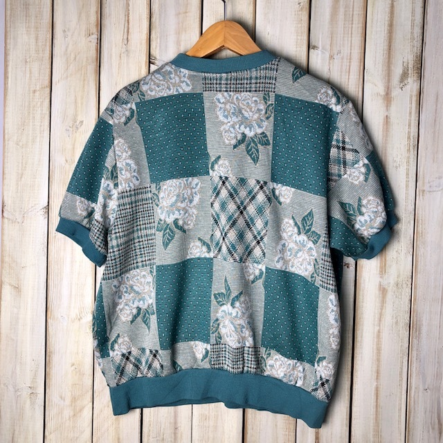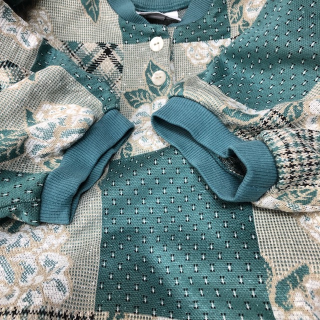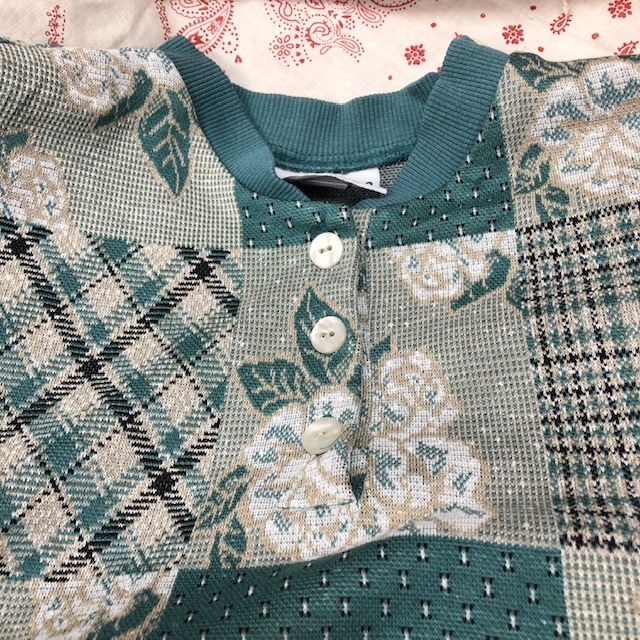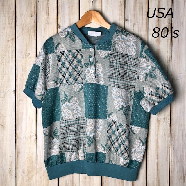 ●商品説明・・・アメリカ買い付け品になります。80年代のオールド・ヴィンテージのグリーン(緑)系の薄い薔薇柄の総柄のカットソーです。ヘンリーネックのポロシャツのような鹿の子織のような生地で、柔らかな質感です。薄手のスウェット感覚で着ていただける感じです。made in USAです。USのM表記で、大きめM~L程度のサイズ感かと思います。
