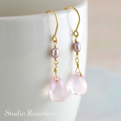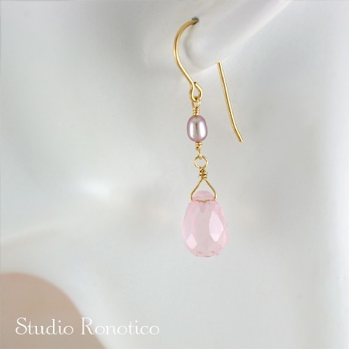 ドロップカットのローズクォーツとパールの揺れるデザインの上品なピアス☆。