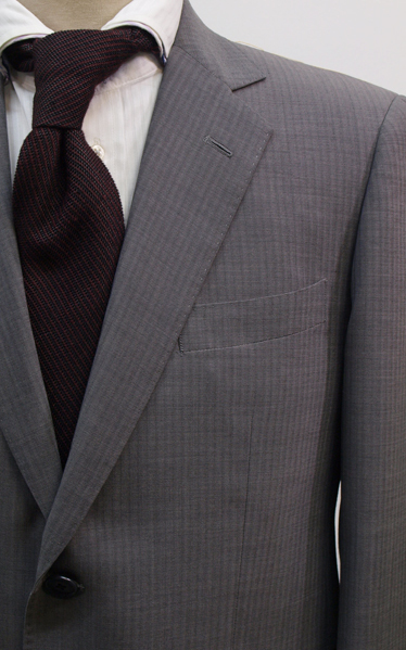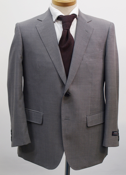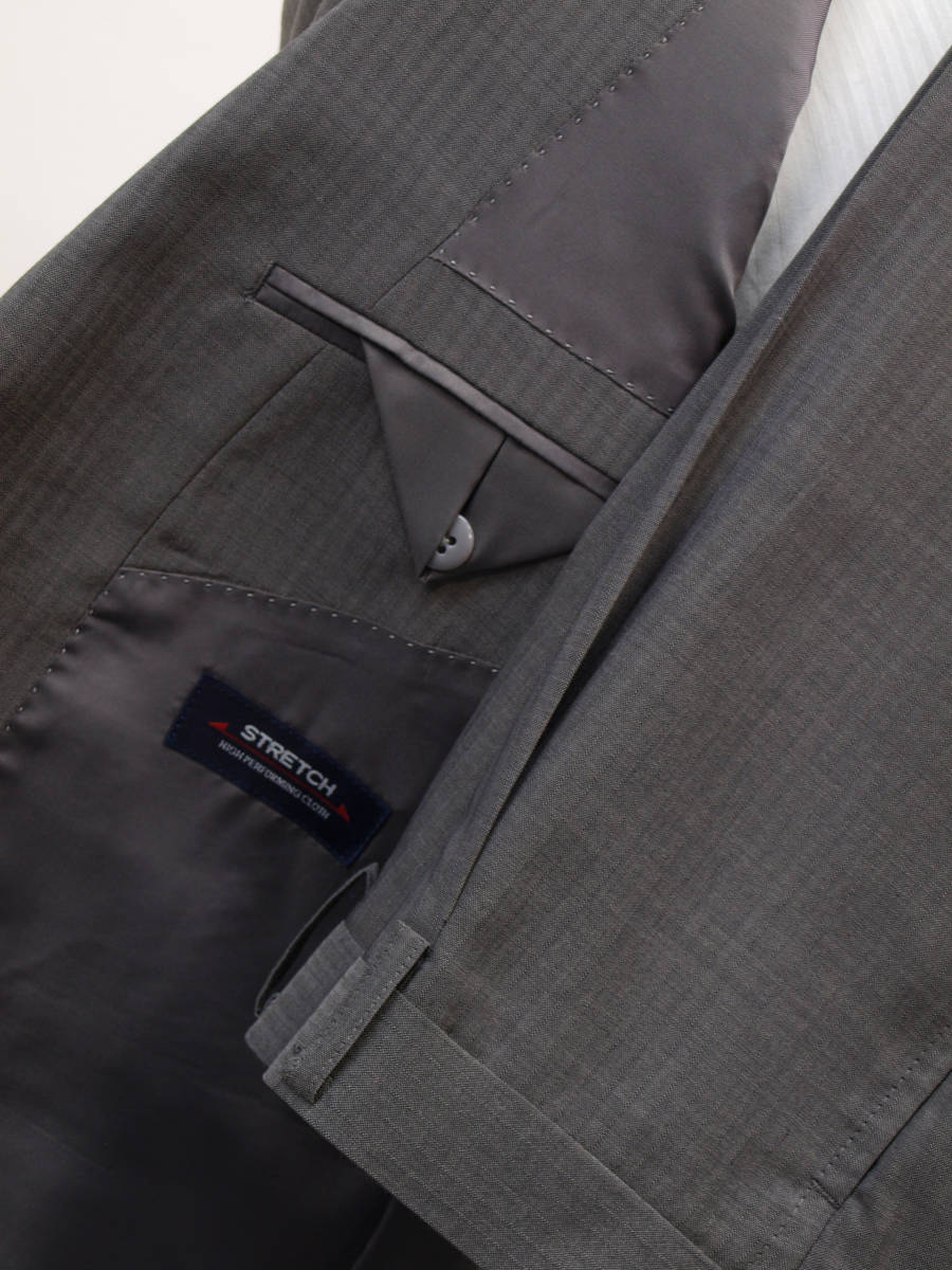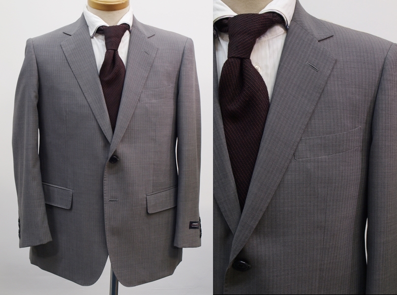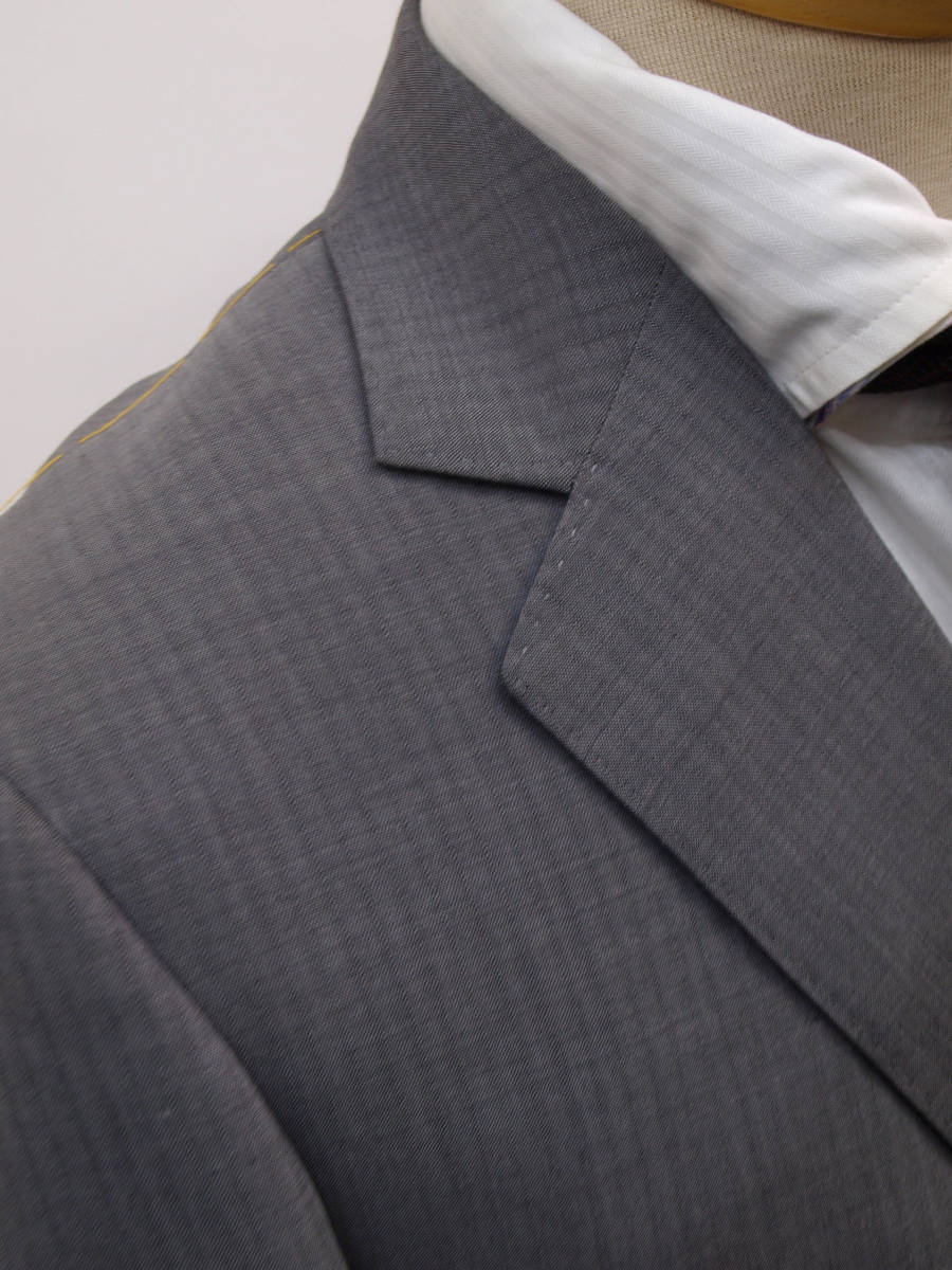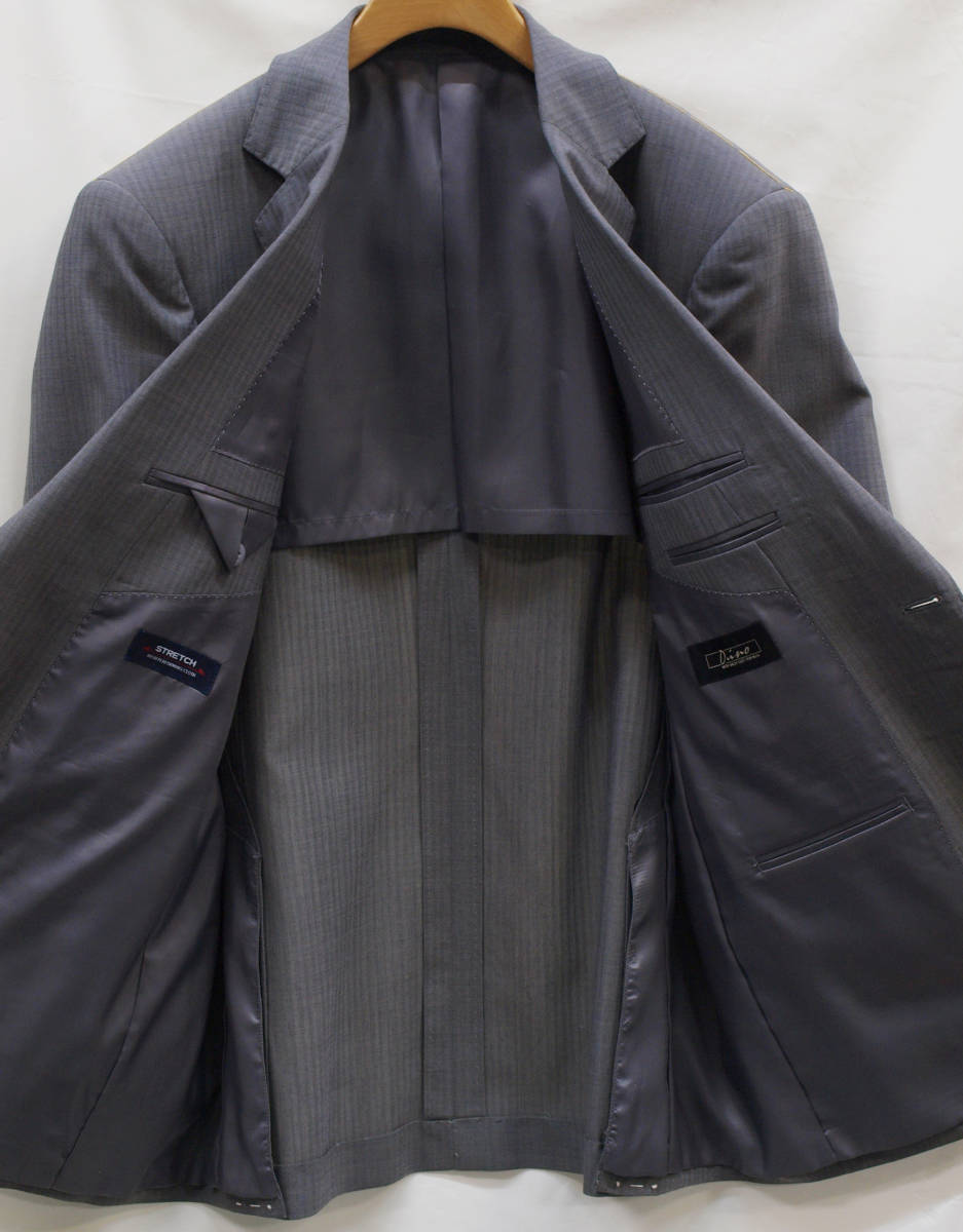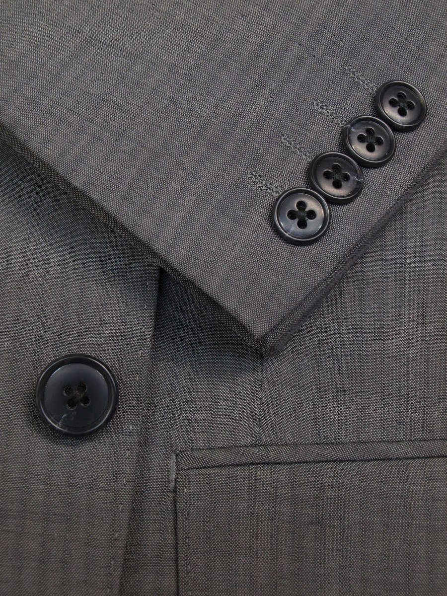 【サイズ】 AB7 (ABLL号相当) 目安の体型 身長175cm~185cm、ウエストサイズ90cm前後 【ジャケット実寸】 肩幅47.5cm 着丈76cm 袖丈62cm 脇下部分56cm 身幅52cm 【パンツ実寸】 ウエスト(胴回り実寸)88cm **通常AB7号サイズのウエストは90cmですがこちらは実寸が少し小さめで88cmとなります。 わたり幅36.5cm 股下10cm部分33cm 裾幅23cm 脇股上26.5cm 前股上29.5cm 股下96cm(裾上げしていない状態/新品) 【素材】 表地:ウール(毛)50% ポリエステル50% 裏地:胴裏/ポリエステル100% 袖裏/ポリエステル100% ・さらっとした薄手の紳士スーツ用サマーウールブレンド生地を使用 【色】 薄グレー 【柄】 ドビーストライプ織柄 【デザイン】 ほどよくゆとりのある着用感のシングル2つボタンスーツ、レギュラーフィット、ビジネススーツ新品、裾上げしていない状態です。 ・ジャケットはシングル2つボタンでレギュラータイプ ・パンツは股上は浅くなくウエストラインで履くタイプで、ややゆとりをもたせたシルエットのワンタックスラックスです。 【縫製仕様】 ・ジャケットはシングル2つボタン、ノッチドラペル、襟縁等AMFステッチ入り、袖口ボタン4つ、サイドベンツ、内ポケット4つ(小ポケット1つ含む)、背抜き(春夏物) ・パンツはワンタック、膝裏当て付き、脇ポケット縦付け、後ろポケット左のみボタン付き、フロントはファスナーでホック仕様/うちかけボタンあり 細部まできちんとしたビジネス仕様の縫製仕立てで仕上がっております。