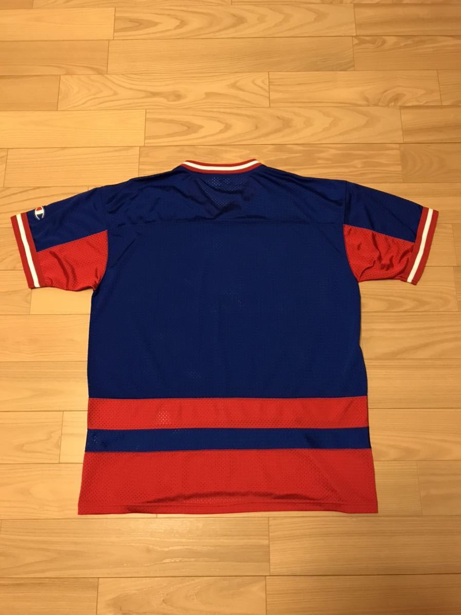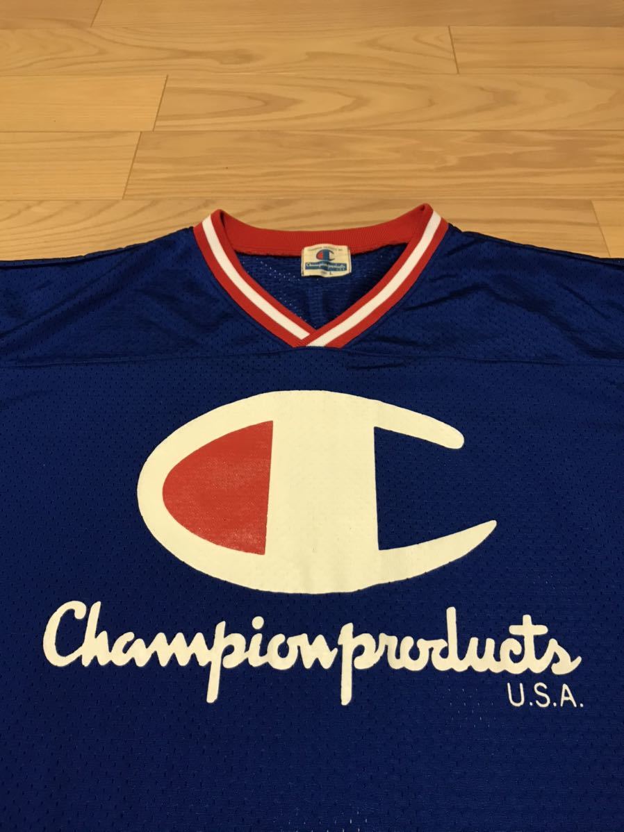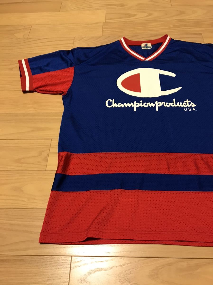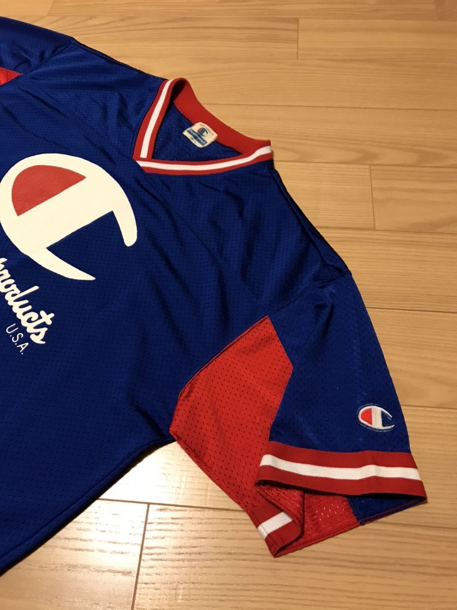 良品☆90s Champion/チャンピオン サイズL 希少.BIGロゴ目付き&全面メッシュ生地 ゲームシャツ・ホッケーTシャツ トリコカラー ビンテージ