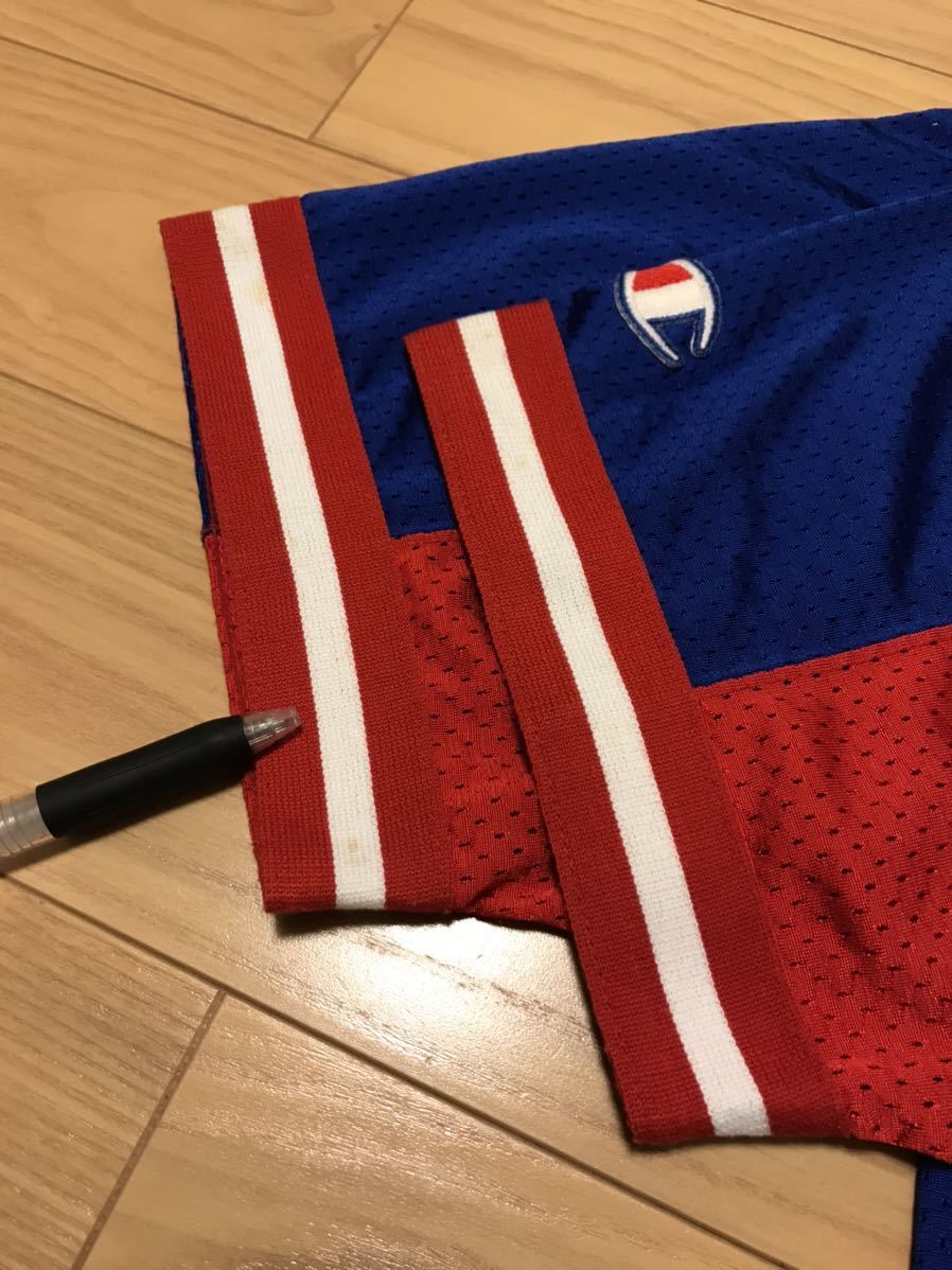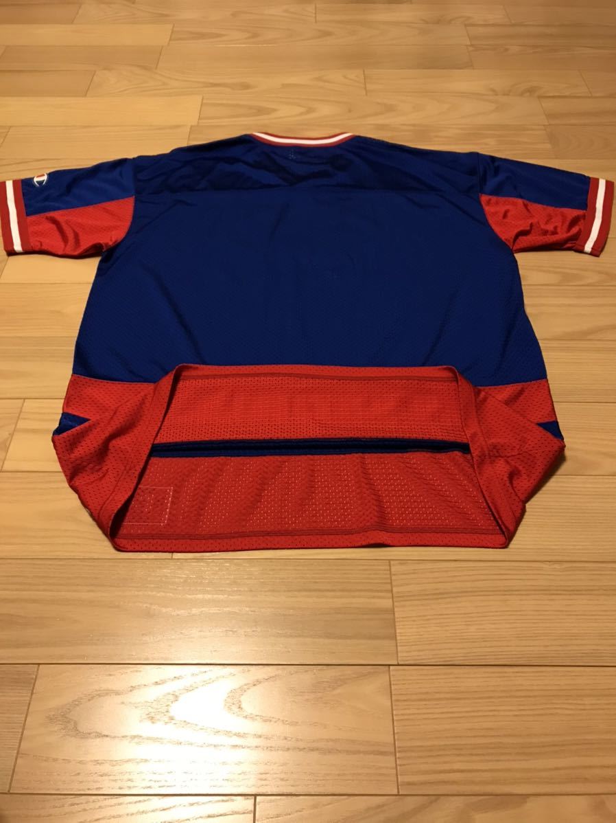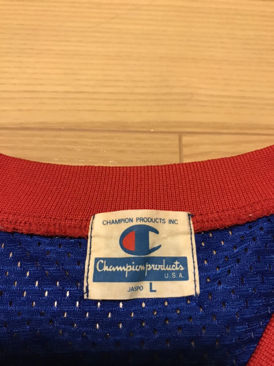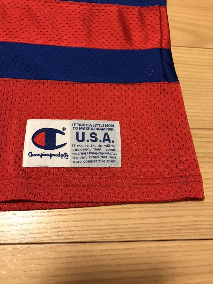 良品☆90s Champion/チャンピオン サイズL 希少.BIGロゴ目付き&全面メッシュ生地 ゲームシャツ・ホッケーTシャツ トリコカラー ビンテージ